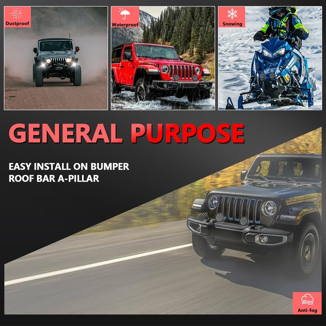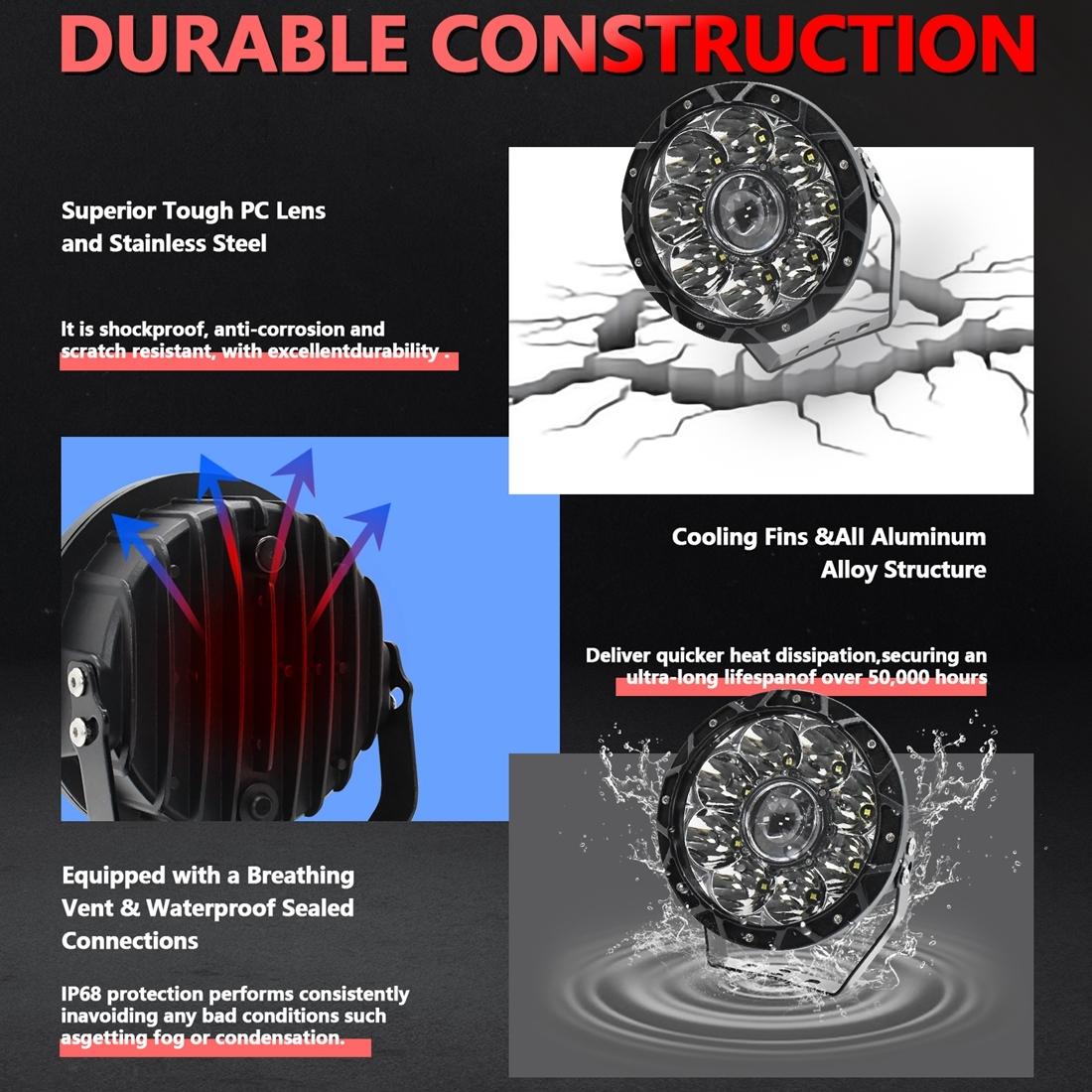 This off-road vehicle round work light features a high-brightness LED strip with multiple chips for enhanced illumination and longer distance coverage. Its durable construction includes a thick die-cast aluminum housing, ensuring reliable performance in harsh environments. The light offers excellent heat dissipation and waterproofing, making it suitable for various outdoor applications such as garden lighting, backup lights, and architectural illumination. Adjustable mounting accessories allow for easy beam direction adjustment after installation.