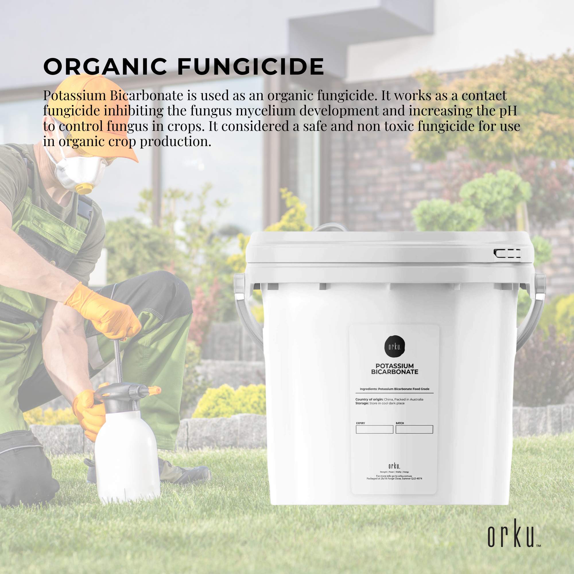 This product is a 5kg tub of organic potassium bicarbonate powder that is food grade and FCC certified. It is a pure white granular powder with no fillers, binders, additives, or preservatives. It is suitable for various food, beverage, and agricultural applications.