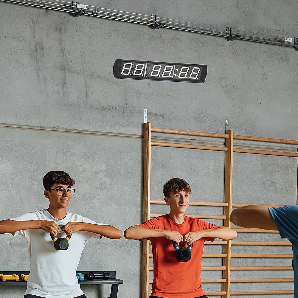 This digital timer features large, brightly lit digits for clear visibility during workouts. The display measures 650mm in length and 120mm in width, while the entire unit is 730mm long, 160mm wide, and 40mm thick. It includes a remote control for flexible placement and easy operation.