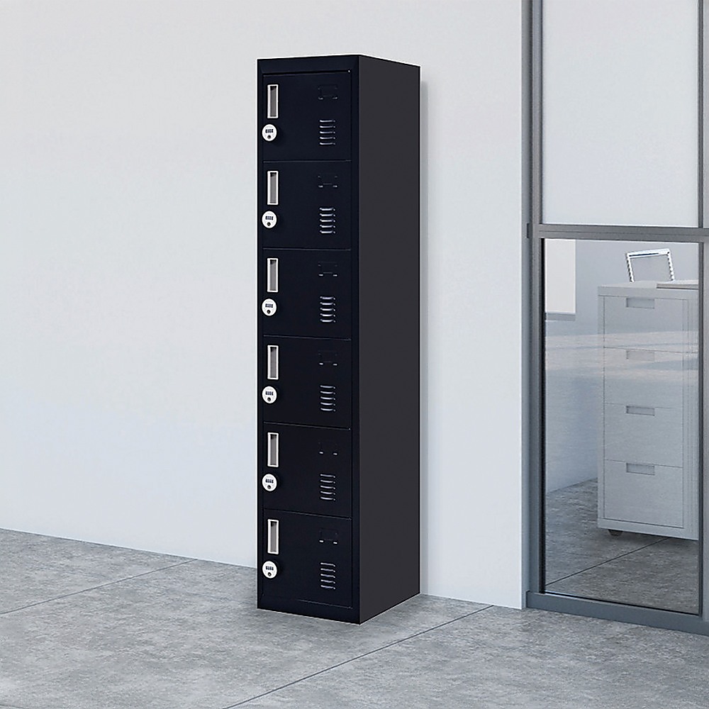 This 6-door locker provides secure and versatile storage suitable for various environments such as offices, gyms, schools, homes, and workshops. Made of durable steel, it features six individual lockers with ventilation and space for name tags or plates. The lockers are lockable with a 4-digit combination lock, ensuring privacy and security. The unit’s design allows multiple units to be placed side-by-side for expanded storage capacity.