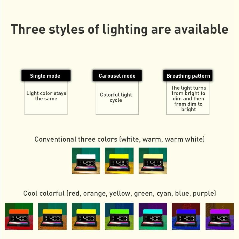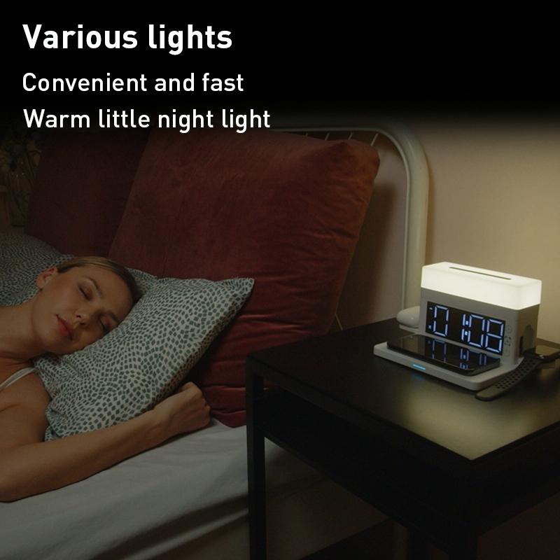 This multifunctional wireless charger combines multiple charging capabilities into a single device, allowing you to charge several compatible devices simultaneously. It features a digital display with clock and alarm functions, providing added convenience for everyday use.