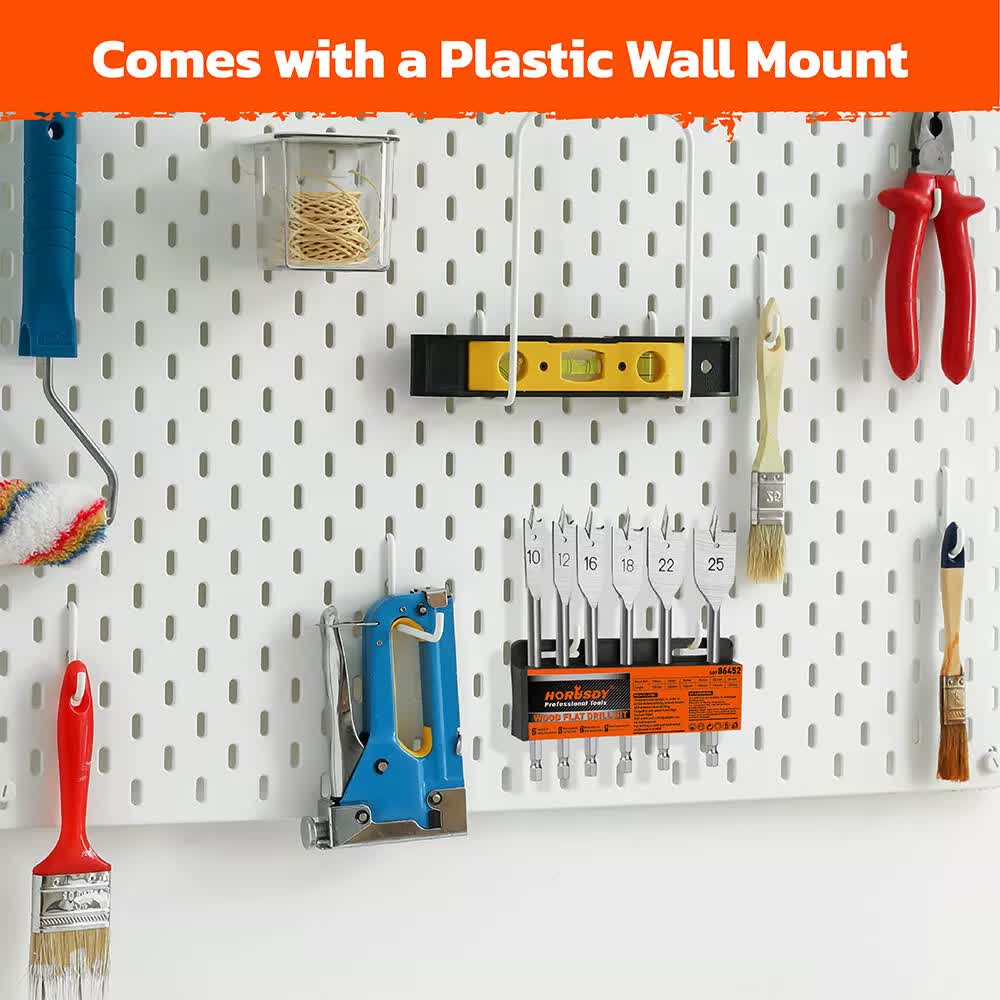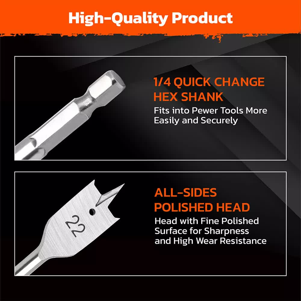 This set includes six flat wood boring spade drill bits designed for efficient and precise drilling. Made from durable carbon steel, these bits are fully heat-treated to ensure long-lasting performance. The flat paddle design with a sharp point allows for easy positioning and stability during use, while the hex shank reduces slipping and prevents falling off. Suitable for various materials including wood, fiberglass, PVC, and soft metals, these bits are ideal for woodworking, furniture making, DIY projects, and more.