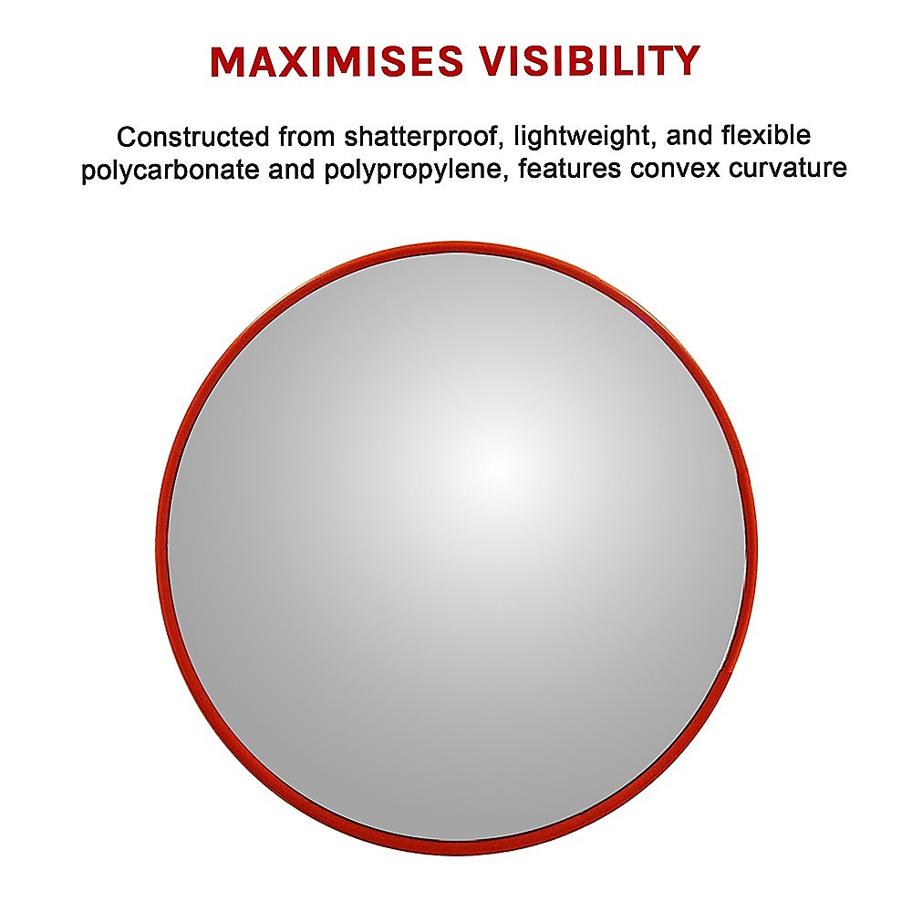 This 60-centimetre wide-angle convex road safety mirror is designed to enhance visibility for motorists and pedestrians. Its convex curvature helps reduce blind spots, allowing for better assessment of tight spots and corners in parking garages, driveways, and narrow streets. The bright orange-red color provides an eye-catching warning of hazards ahead, and its two-metre viewing distance offers ample space for safe maneuvering.