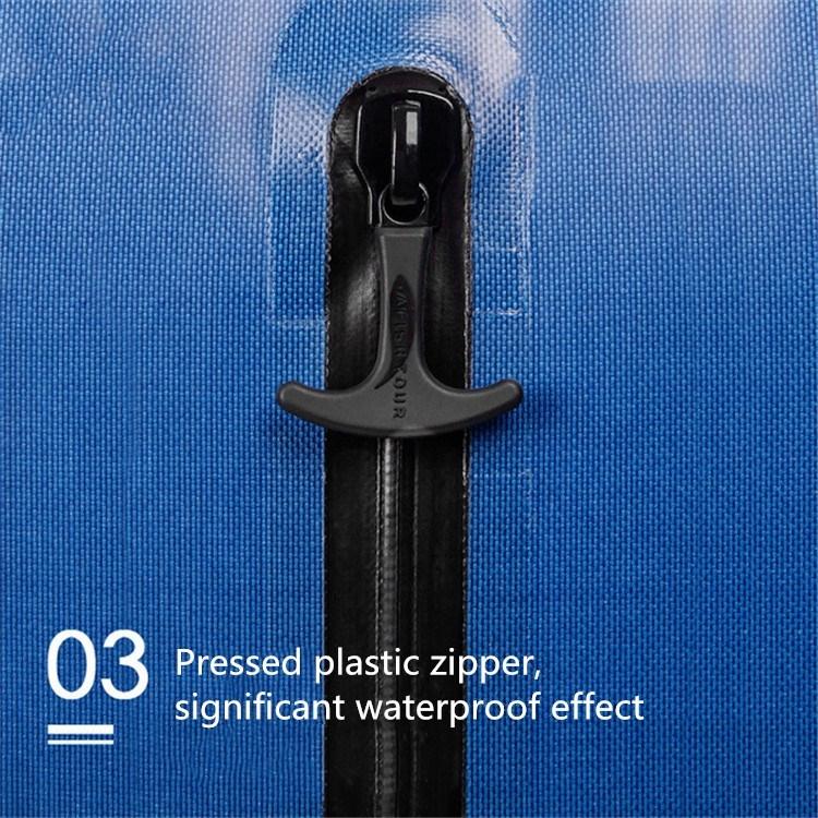 This waterproof backpack offers a large capacity suitable for swimming, diving, surfing, and mountaineering activities. Made from durable, tear-resistant, and waterproof materials, it ensures your belongings stay dry and protected during outdoor adventures. The design includes ergonomic shoulder straps for comfort, a gas valve for releasing excess air, and multiple storage options with extension straps and D buckles.
