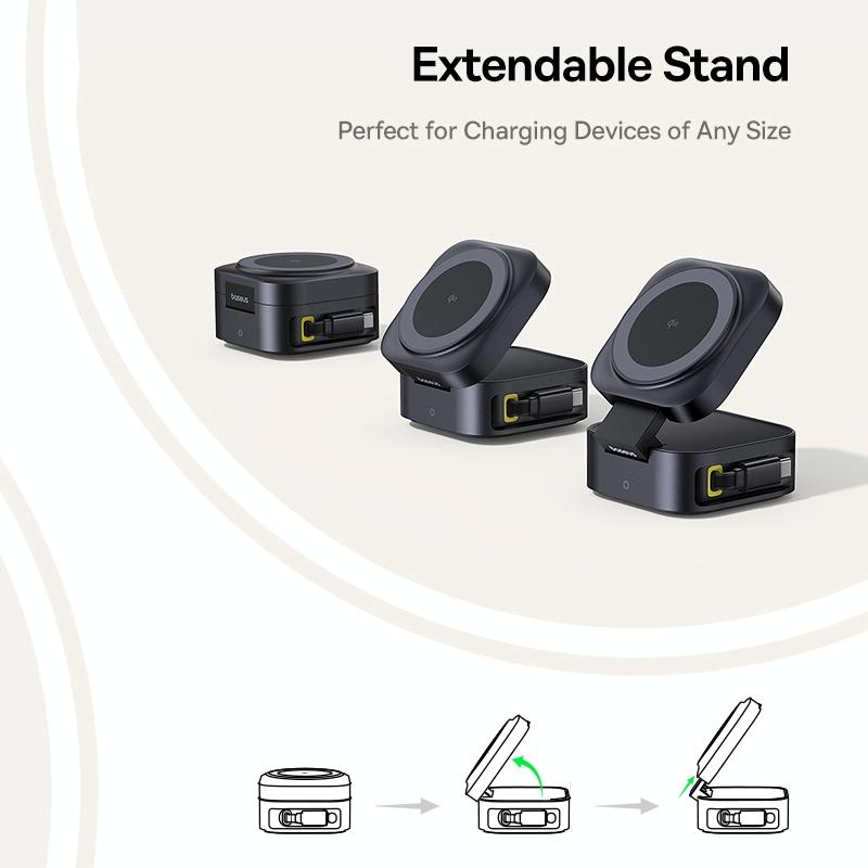 This 67W 2-in-1 magnetic wireless charger offers versatile charging options with a compact and portable design. It features wireless charging for mobile phones, a retractable Type-C cable for high-power output, and adjustable angles for convenient viewing and use.