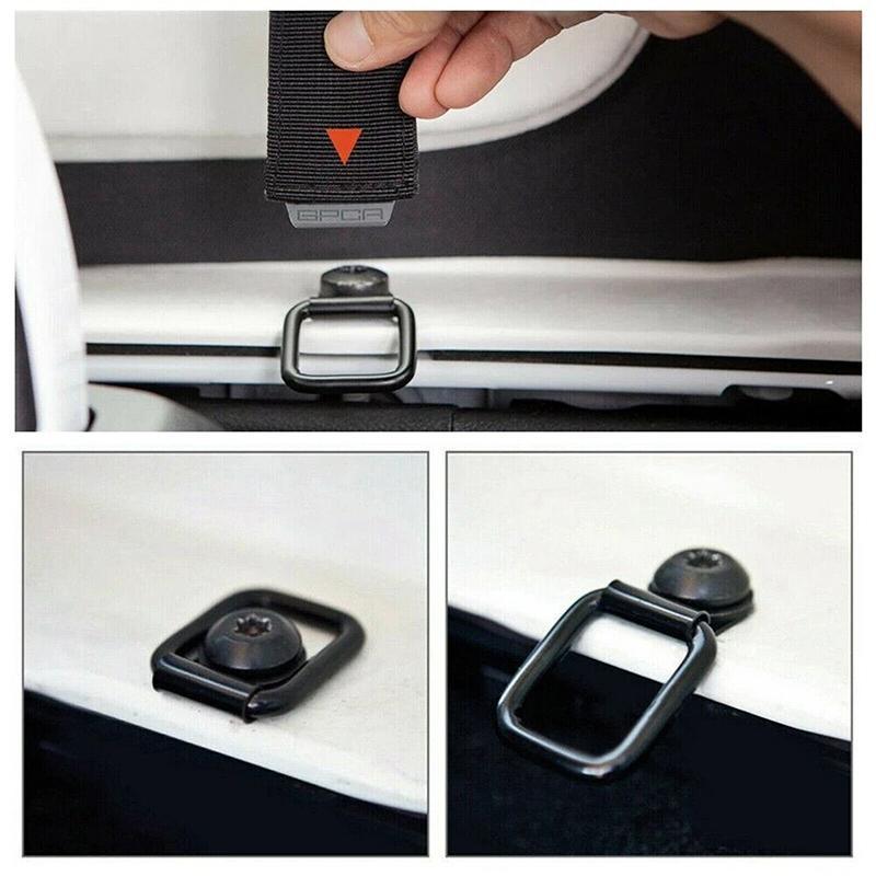 This set includes six heavy-duty black metal D-ring hooks designed for secure cargo management. These versatile anchor points are suitable for various vehicle models and can be installed in the trunk or cargo area to attach storage nets, straps, or other accessories. Crafted from durable corrosion-resistant material, they feature a swiveling design that allows adjustment at any angle for optimal utility and load security during travel or off-road activities.