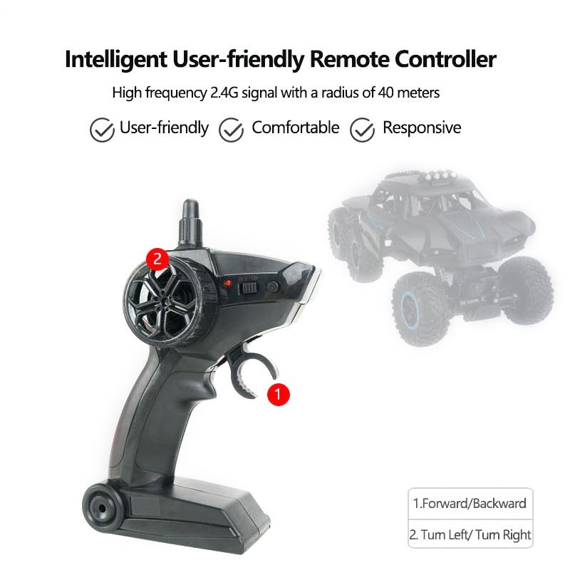 Package includes one 1/12 scale off-road remote control car. The car features shock absorbers, independent suspension, and high-traction rubber tires for enhanced performance on various terrains. It also has dazzling lights for an engaging visual experience.