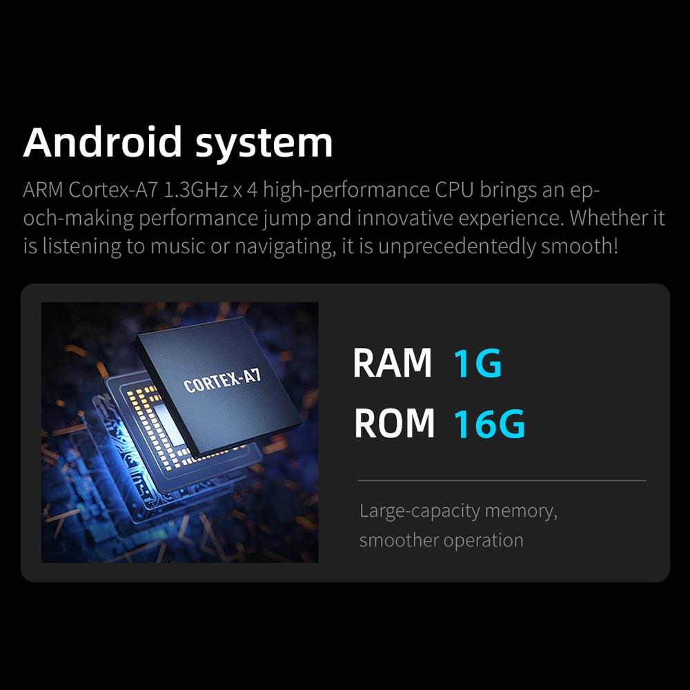 Specifications include an Android 10.1 system, a 7-inch HD display with a resolution of 1024×600, and support for various audio, video, and image formats. It is powered by a quad-core A7 CPU at 1.3GHz, with options for 1GB or 2GB RAM and 16GB or 32GB storage. The device operates within a voltage range of 12 to 14.4V and features multiple USB ports, RCA outputs, and supports GPS satellite signals from GPS, Glonass, and Beidou systems.
