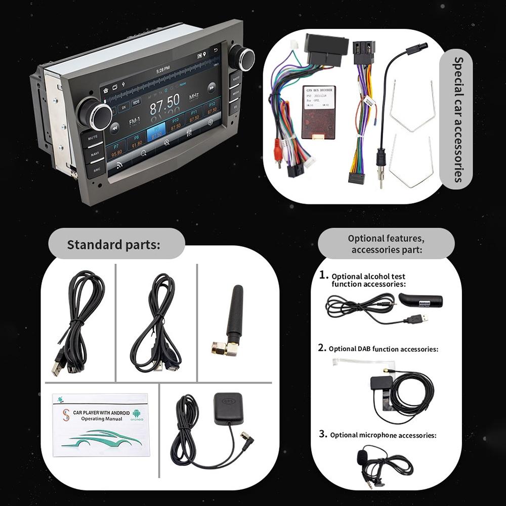 Package includes the 7-inch car MP5 player with DAB function supporting Carplay and Android Auto. The specific contents depend on the selected options.