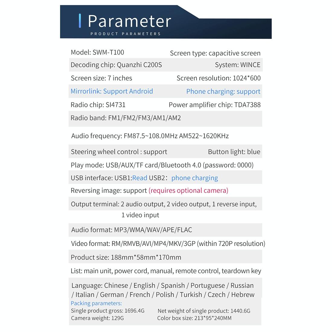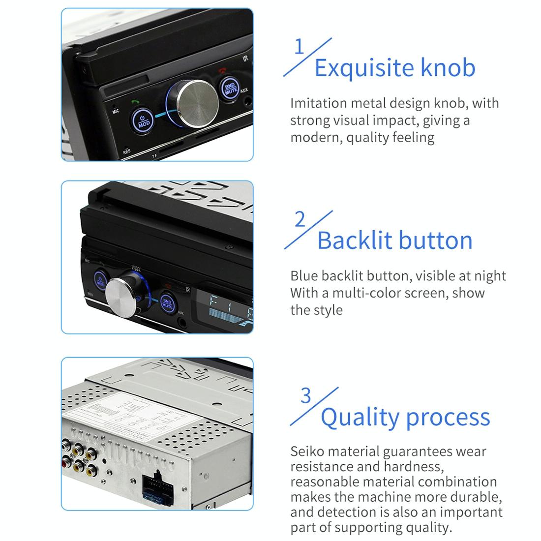 This 7-inch HD car radio receiver offers a versatile multimedia experience with various connectivity options and features designed for convenience and entertainment. It supports Bluetooth for hands-free calls and music playback, FM/AM radio with RDS, and phone linking capabilities for Android devices. The device also includes a foldable display, reverse camera support, video input, and multiple audio and video format compatibilities, making it suitable for a range of in-car entertainment needs.