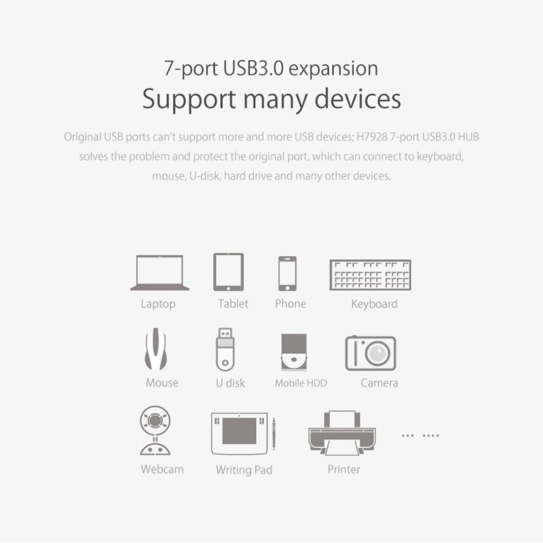 This 7-Port USB 3.0 Desktop Hub features high-speed data transfer capabilities and a compact, stable design. It helps organize your workspace by providing multiple USB ports in a single device, making it ideal for connecting various peripherals efficiently.