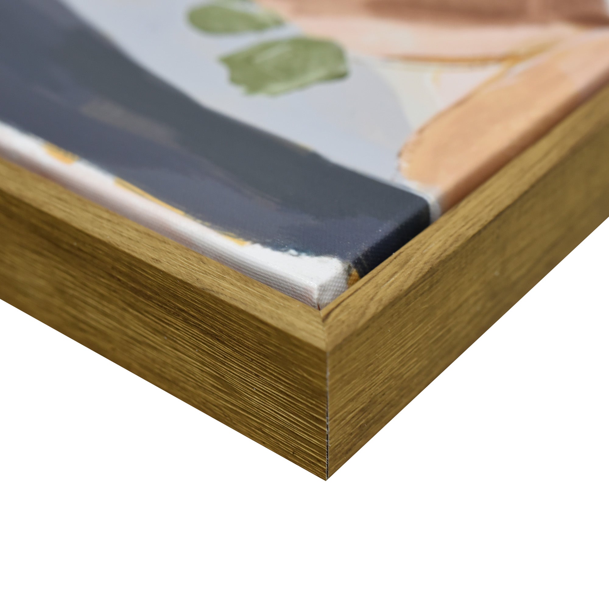 - The artwork is stretched and gallery wrapped around a wooden stretcher with a floating frame, creating a visual gap that enhances the floating effect and makes the print stand out.
