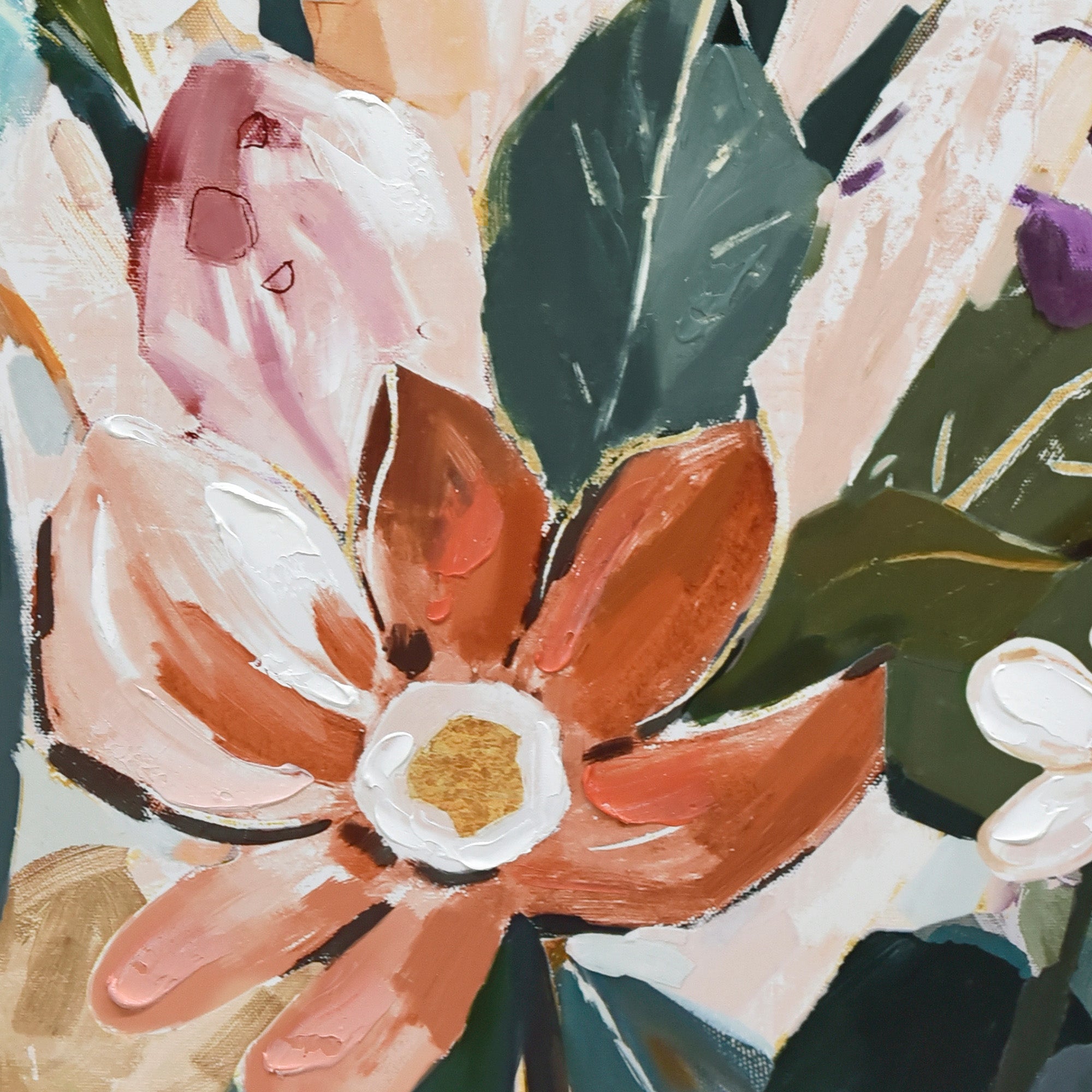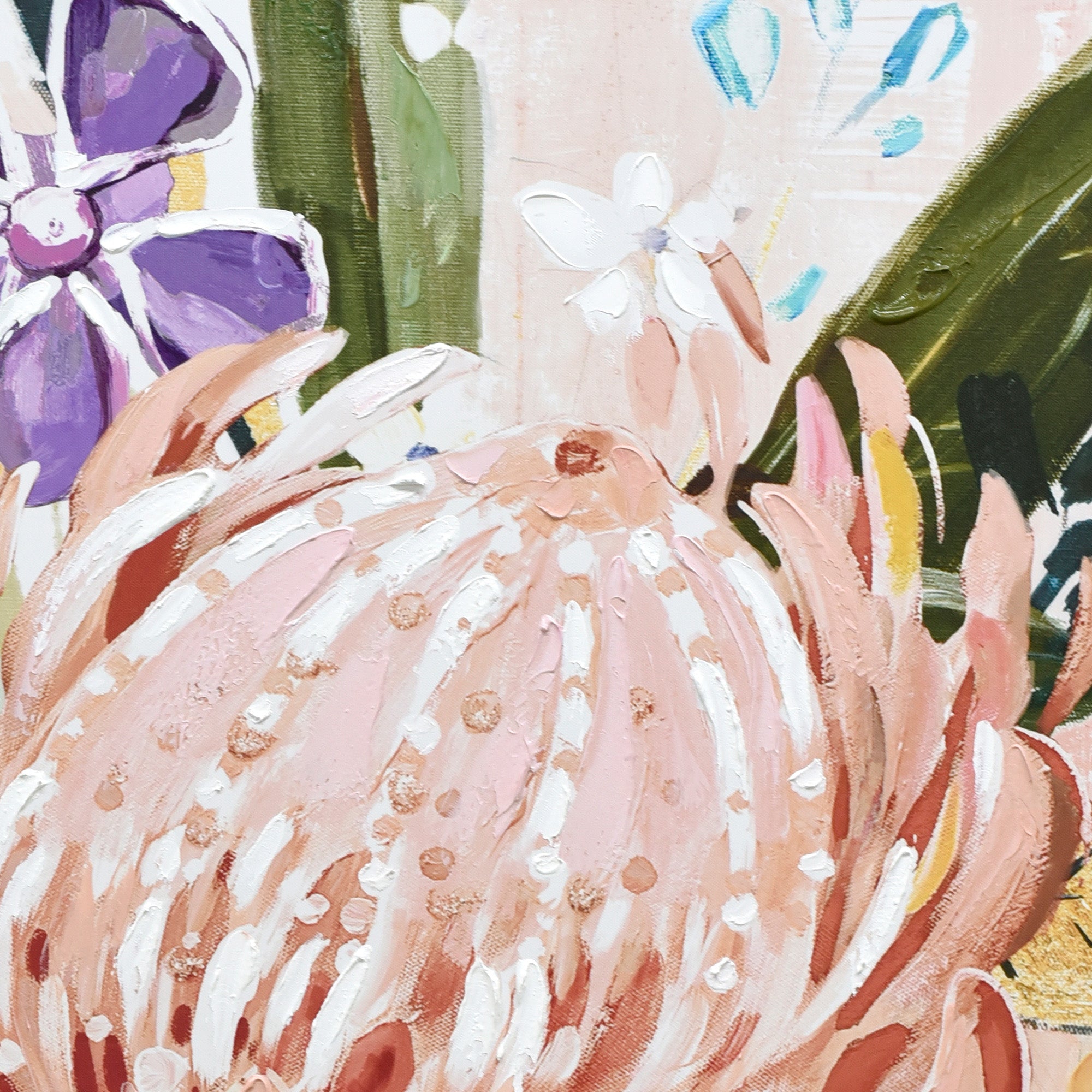 Experience the vibrant beauty of native flowers with this 80cm x 120cm canvas wall art. Encased in a dark wood frame, it features a detailed blend of hand-painted and printed elements that highlight the intricate details of each bloom, leaf, and stem. This artwork adds a touch of nature’s charm to any space, making it a perfect choice for botanical enthusiasts and art lovers alike.
