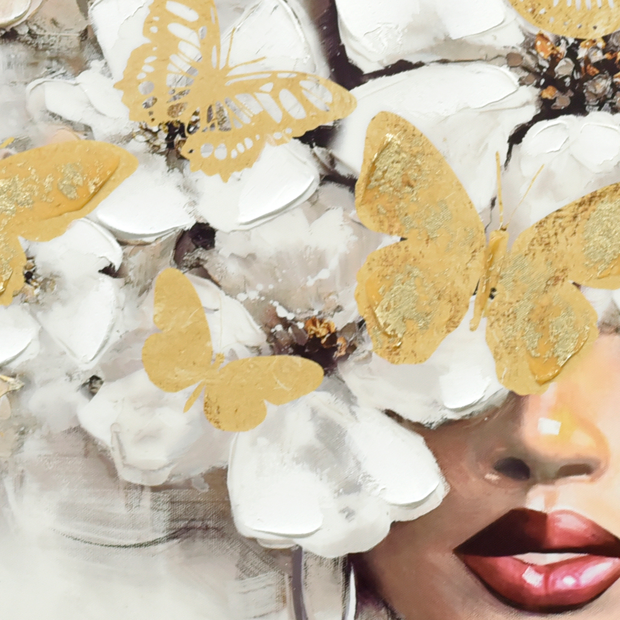 This wall art features a captivating floral design with a dark wood frame, measuring 80x80cm. It combines hand-painted and printed elements to create an enchanting scene that blends human and nature motifs, making it a striking addition to any space.