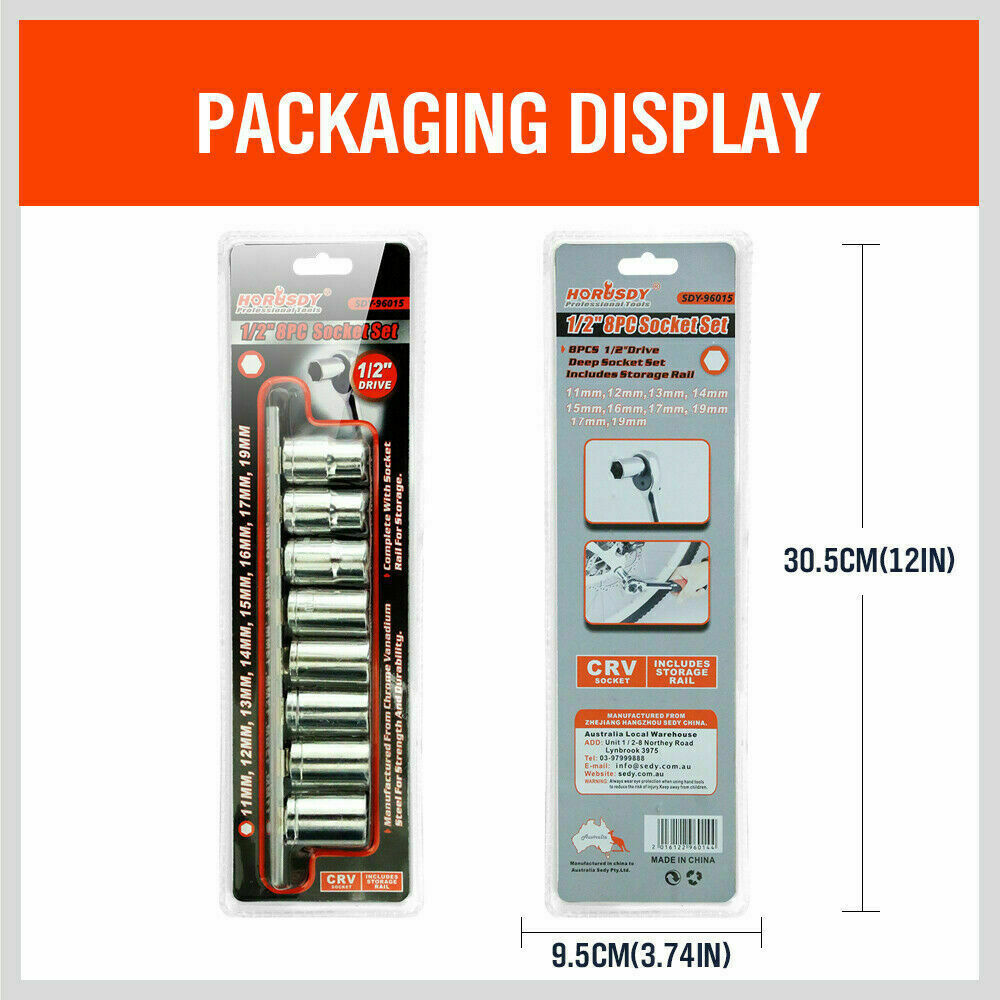 • Set includes sockets for sizes 11mm, 12mm, 13mm, 14mm, 15mm, 16mm, 17mm, and 19mm, all compatible with 1/2″ drive tools
