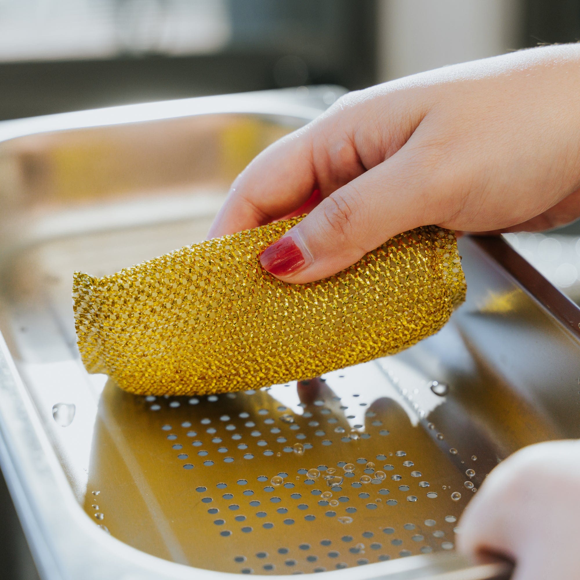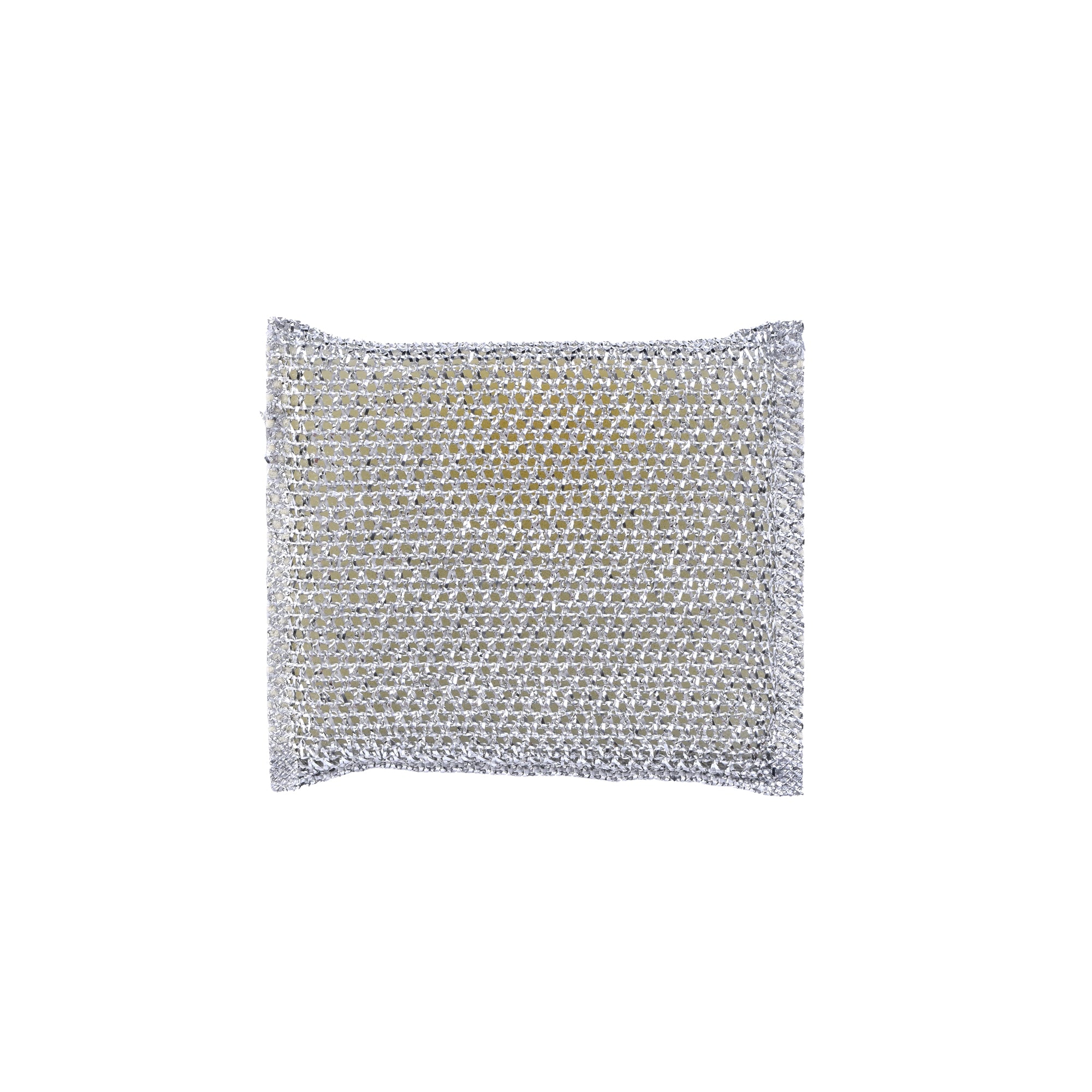 This non-scratch mesh sponge is designed for gentle cleaning with a metallic silver and gold finish. It is highly absorbent, durable, and features a soft core for safe use on various surfaces. Ideal for maintaining a spotless and polished appearance in your kitchen or household cleaning tasks.