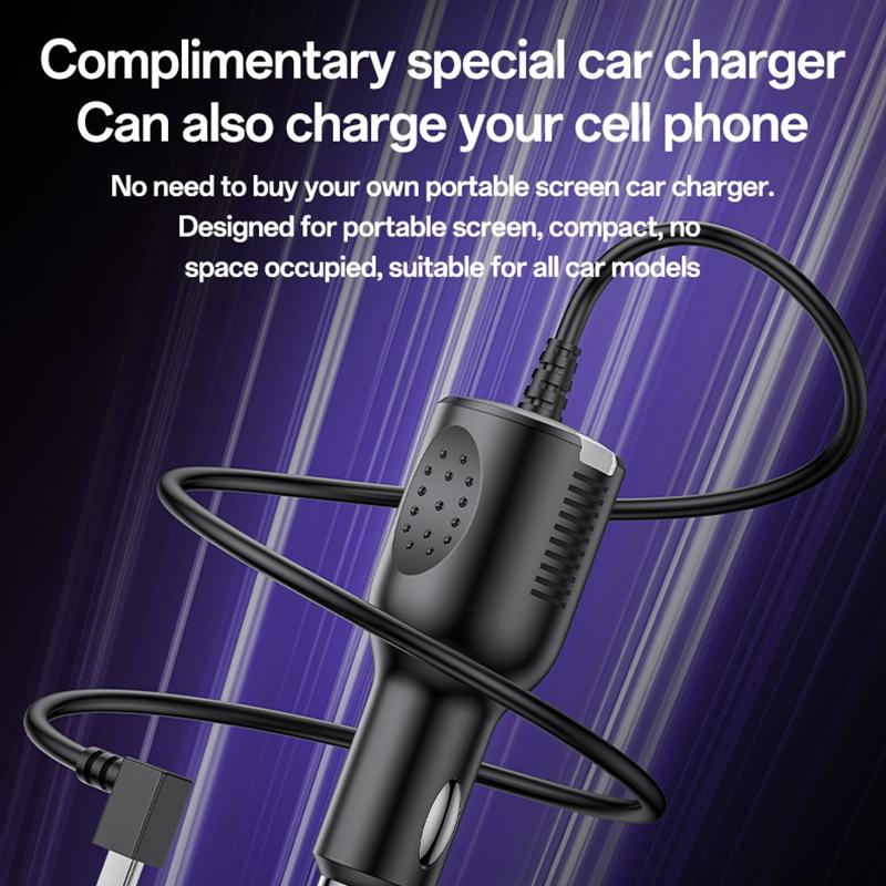 Specifications include an allwinner V553 CPU solution, a 1024×600 resolution display, tempered glass touch screen, 2GB DDR3 running memory, and 512MB NAND flash. It features a three-axis G-sensor, front and rear cameras with high resolution, a Type-C power supply interface, and an 8-ohm 2W speaker. The device can be fixed on the center console for easy access and operation.