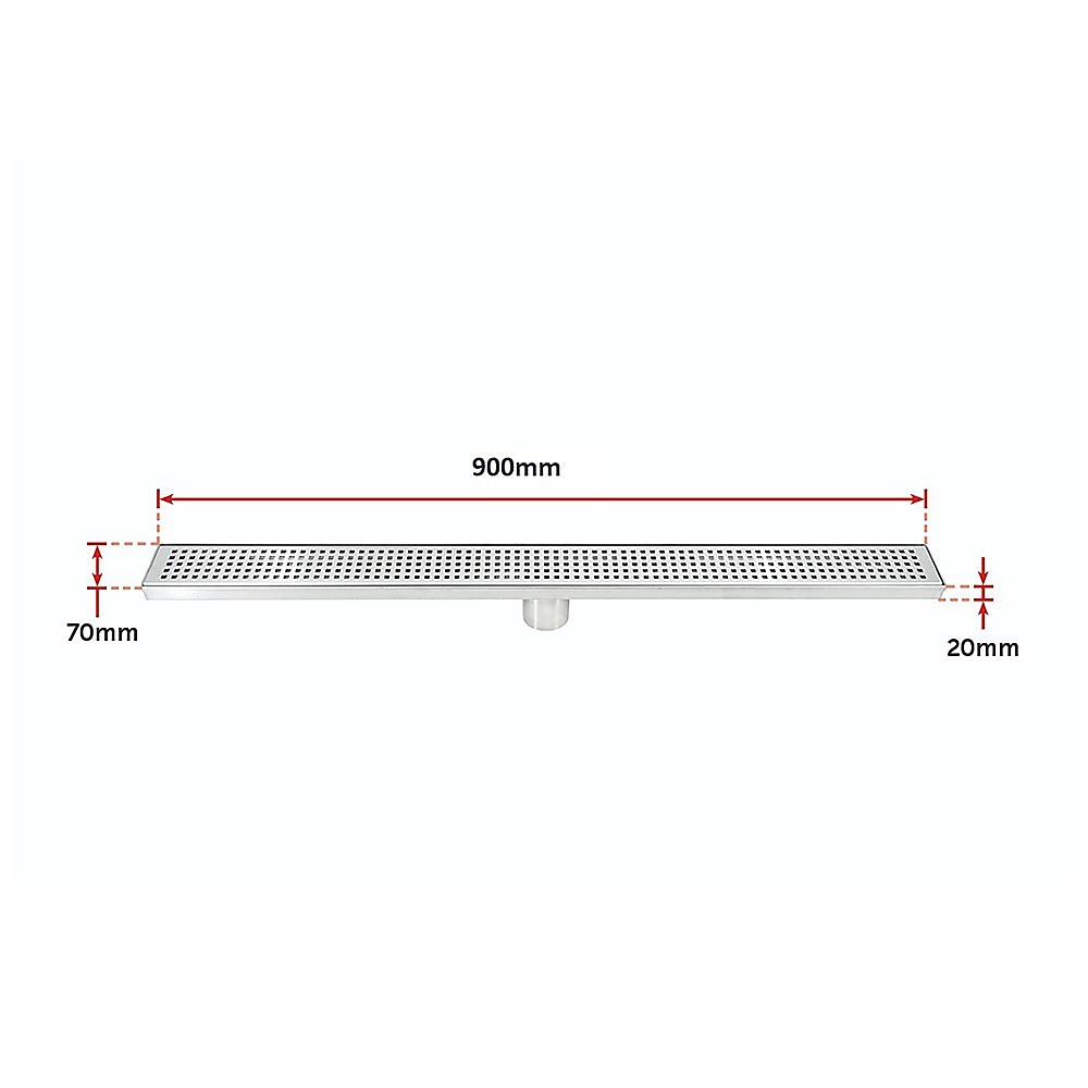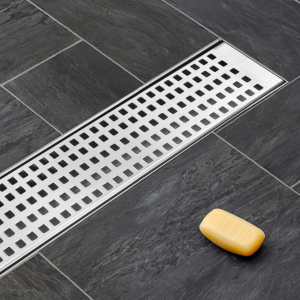 This 900mm bathroom shower grate is designed for efficient water drainage in various areas such as showers, washrooms, bathrooms, and kitchens. Made from durable stainless steel, it features a square pattern that combines functionality with a modern aesthetic. The grate directs water flow directly to the center outlet, ensuring reliable drainage performance.