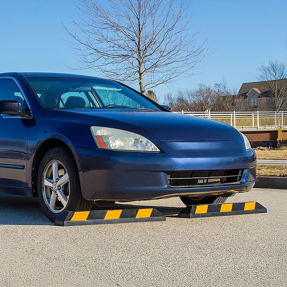 This heavy-duty rubber curb is designed to enhance parking safety and protect vehicles from bumps and scrapes. Its high-visibility black and yellow color ensures visibility in various lighting conditions, helping drivers park accurately and safely while safeguarding surrounding landscaping and structures.