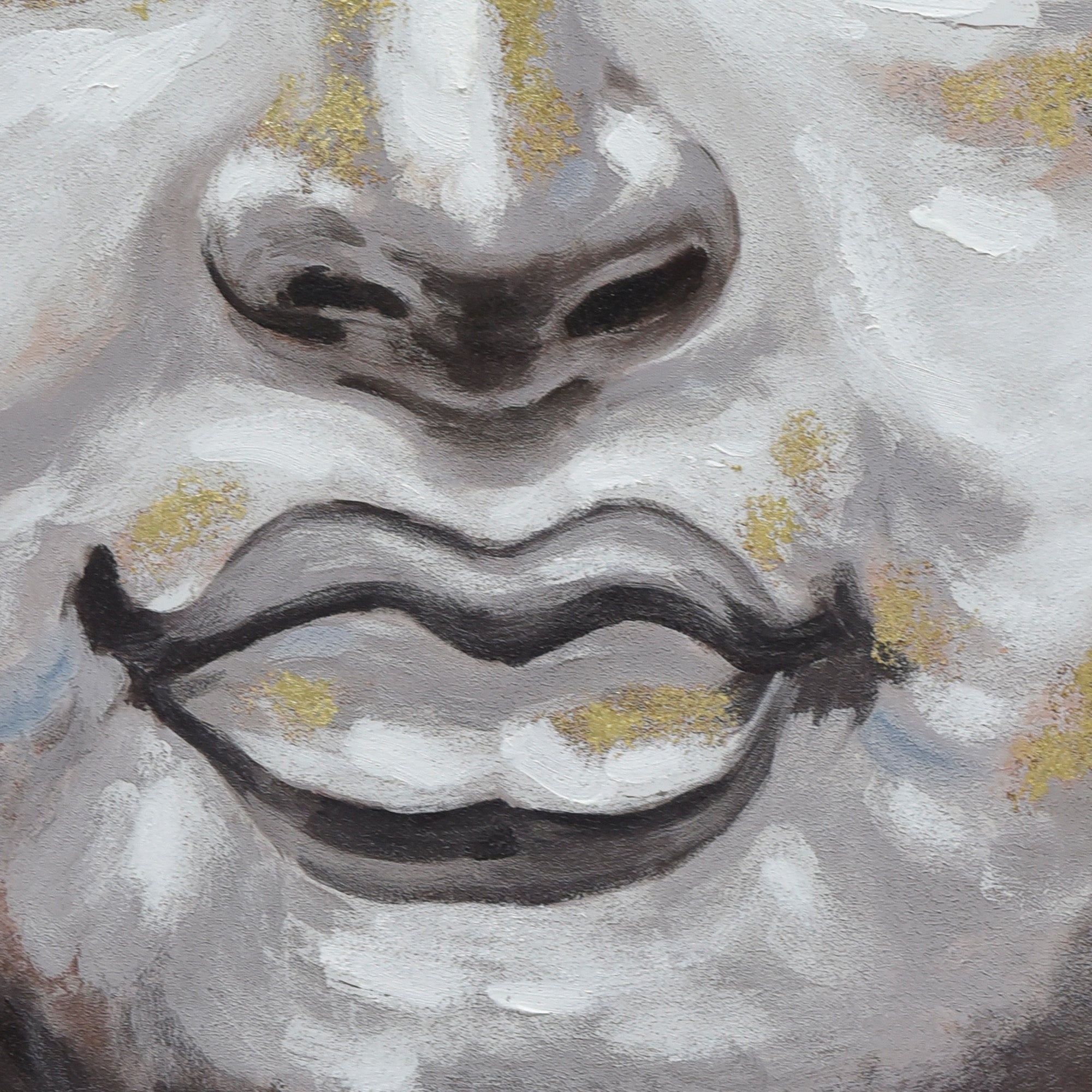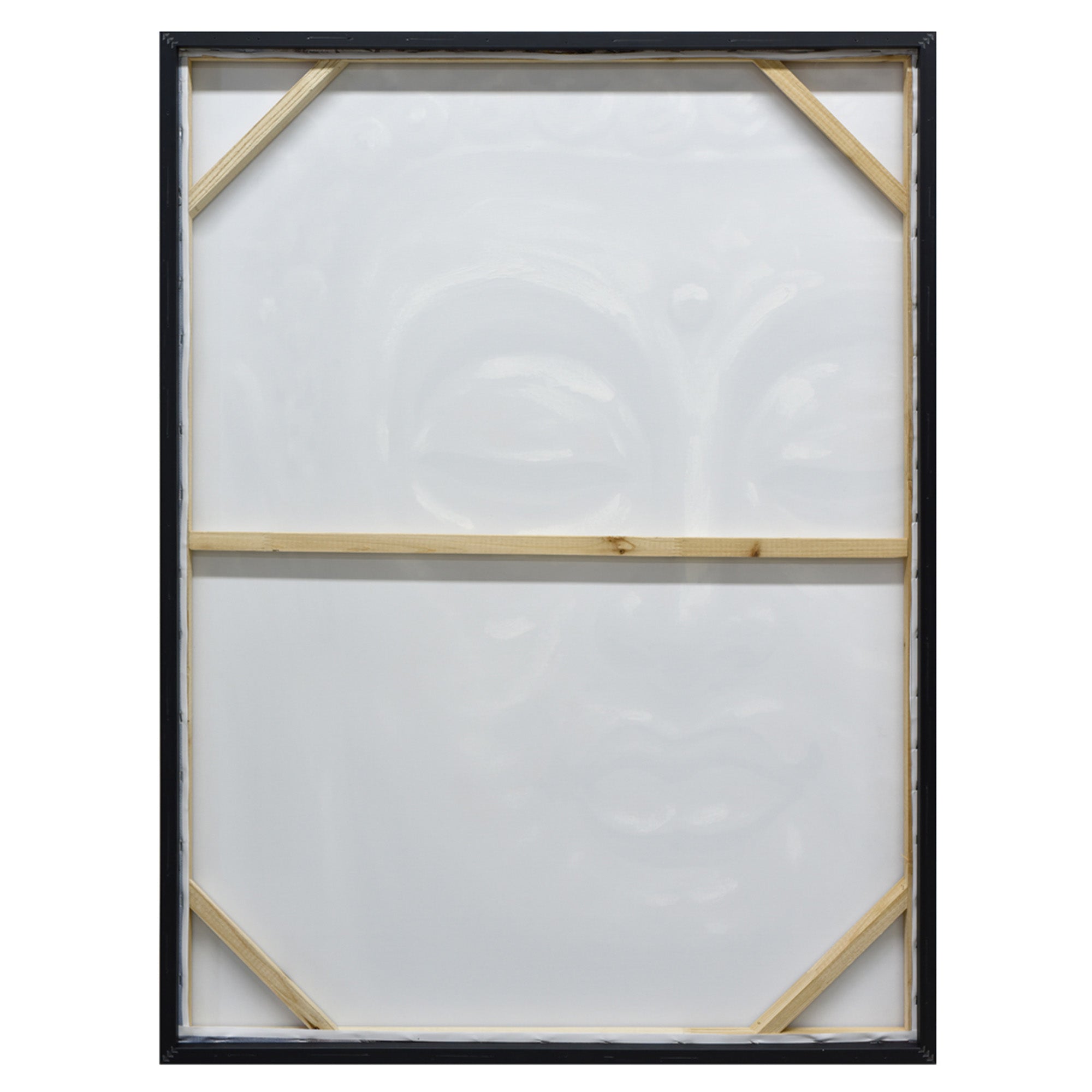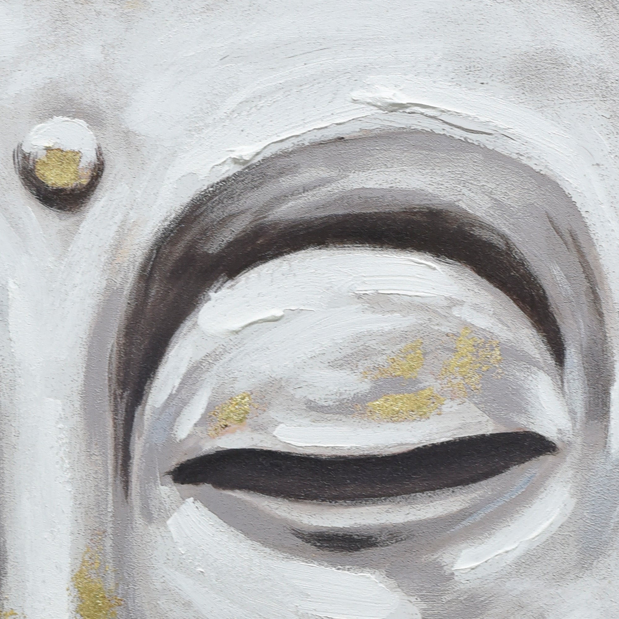 This wall art features a serene depiction of spiritual tranquility, focusing on a close-up of a Buddha face with soft hues and delicate gold accents. The artwork emphasizes peace and introspection, making it a calming addition to any space. The piece is framed in a champagne-colored frame that enhances its elegant appearance, suitable for creating a peaceful atmosphere.