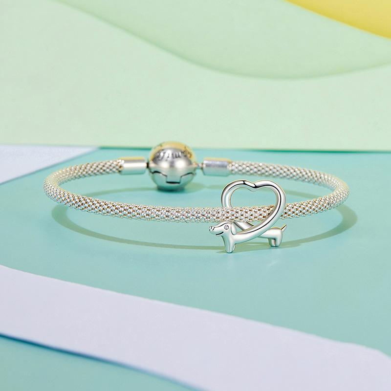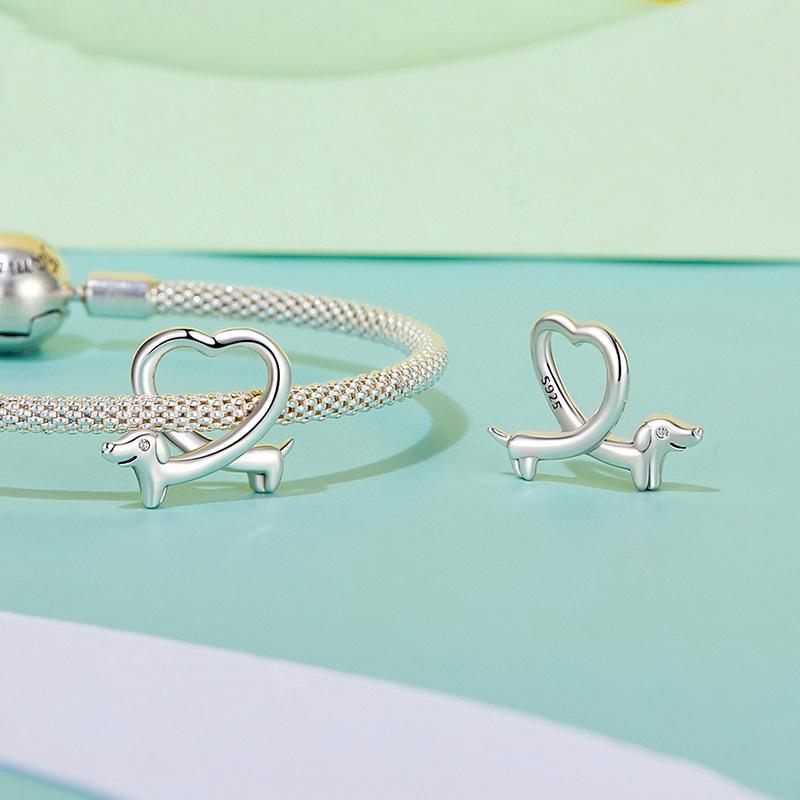 This product is a silver dachshund bead accessory crafted from high-quality materials, designed to add charm and elegance to your jewelry collection. It features a detailed animal design with a diamond-like shine, making it suitable for fashionable wear. The bead is lightweight and comfortable for everyday use.