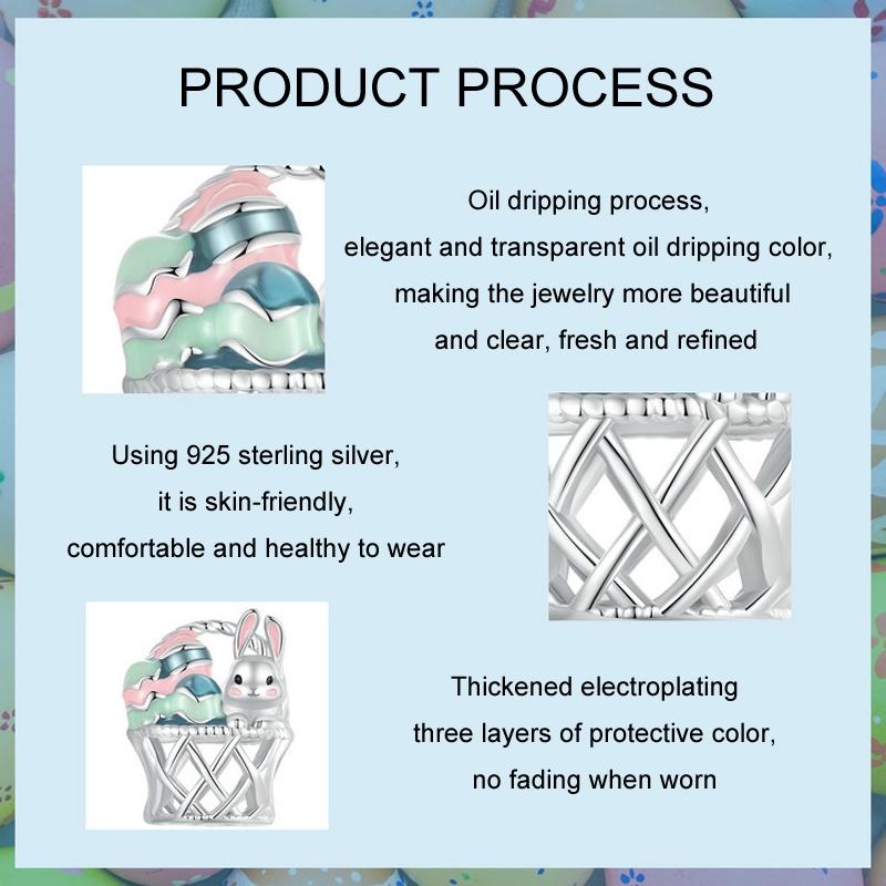 This product features a beautifully crafted Easter Basket Egg Rabbit Bead made from high-quality 925 sterling silver. It showcases an elegant and transparent oil dripping color, combined with a unique design that measures 14x11mm in height and width. The bead is lightweight, weighing approximately 2.4 grams, and is designed for easy use with a 4.5mm aperture. Its thickened electroplating ensures a long-lasting and refined appearance, making it a perfect accessory for your jewelry collection.