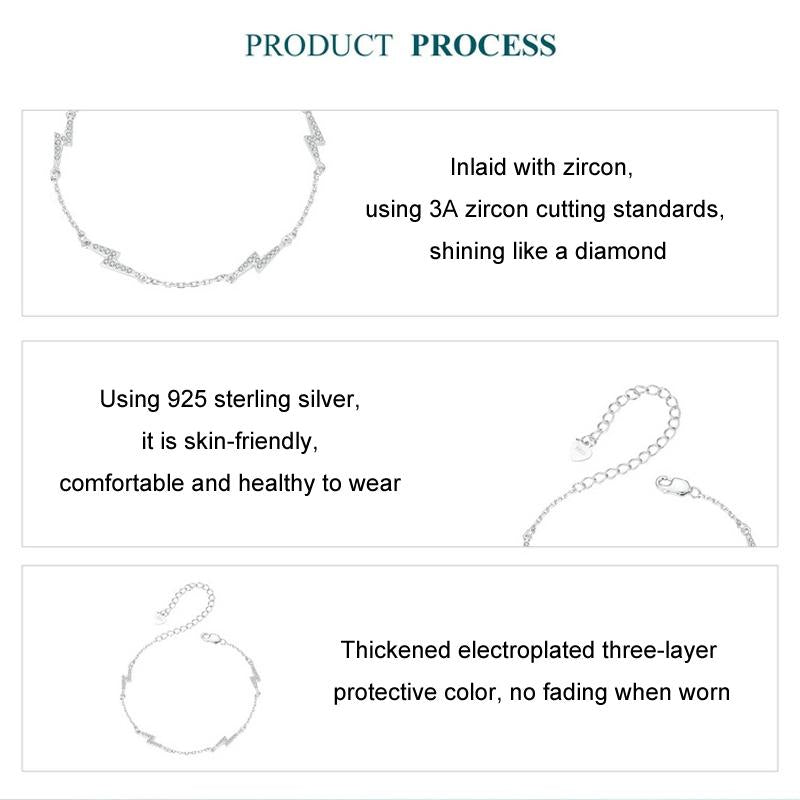 This lightning bracelet is crafted from high-quality 925 sterling silver and features a sleek, stylish design. It is inlaid with high-grade zircon stones that provide a brilliant, diamond-like shine. The bracelet is lightweight, comfortable to wear, and designed to be skin-friendly, making it suitable for everyday use. Its durable electroplating with a three-layer protective coating helps prevent fading and maintains its appearance over time.
