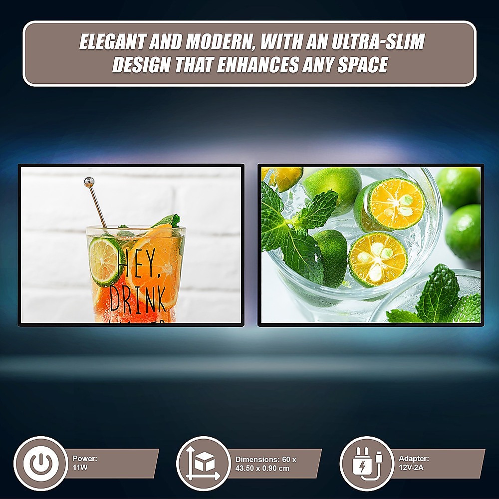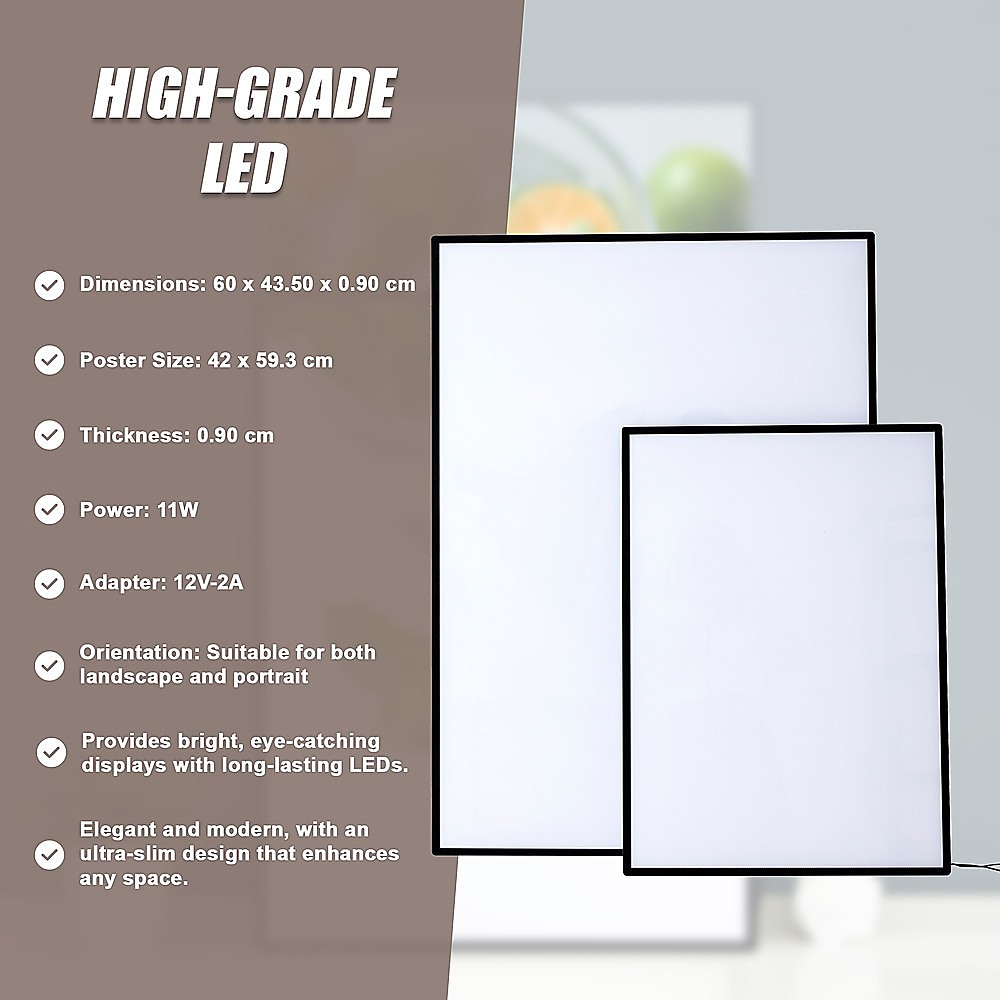 This A2 LED Slim Advertising Lightbox Sign is a sleek and modern wall-mounted poster board designed for various commercial environments such as restaurants, bars, takeaways, and retail spaces. It features an ultra-thin profile and high-quality LED illumination, providing bright and consistent backlighting to make your advertisements and menus stand out. The durable construction and easy-to-use design make it an ideal choice for effective and eye-catching displays.