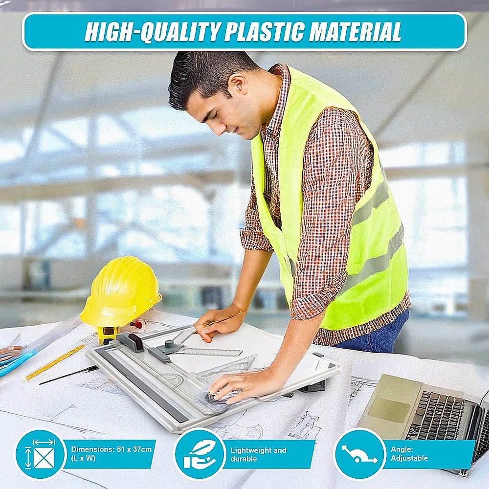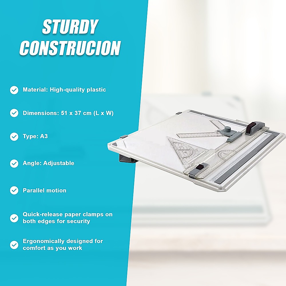 This A3 drawing board table is designed for artists, designers, architects, and builders who need a portable and ergonomic workspace. Made from high-quality plastic, it combines durability with lightweight convenience, making it easy to move between rooms and work comfortably. The table features adjustable angles and parallel motion guides to enhance precision and ease of use, suitable for both professional and hobbyist projects.