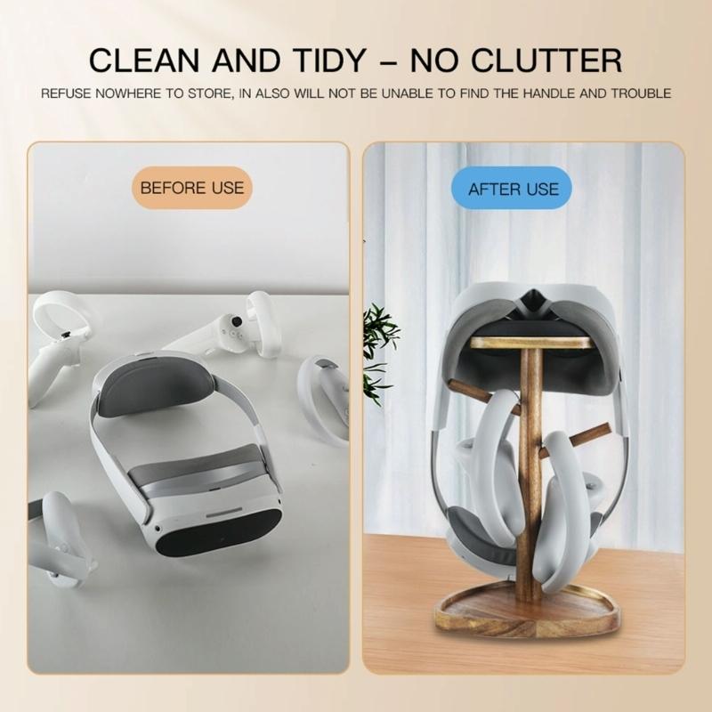 This storage rack is designed for VR devices, offering a simple and space-efficient solution for organizing your headset and accessories. Its stable triangular structure ensures safety and non-slip performance, making it suitable for various VR headsets. Crafted from durable and insect-resistant wood materials, it combines functionality with an attractive appearance.