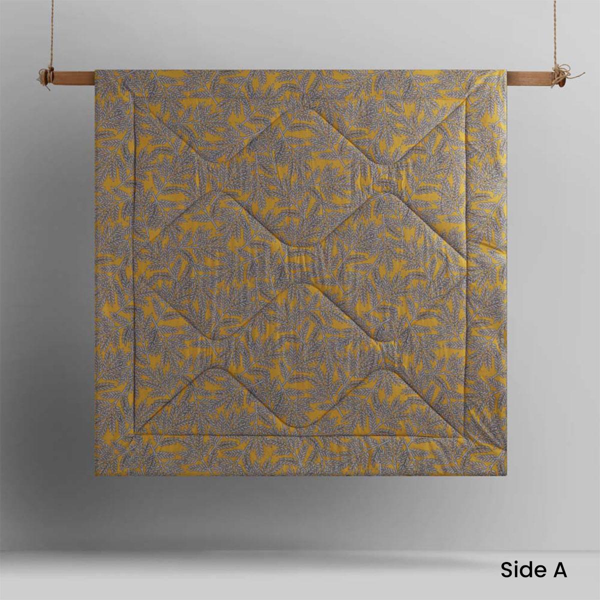This reversible comforter set features a digital printed foliage design in a combination of mustard, grey, brown, and silver tones. Made from 100% cotton with polyester filling, it offers all-year-round comfort and warmth, combining stylish design with affordability.
