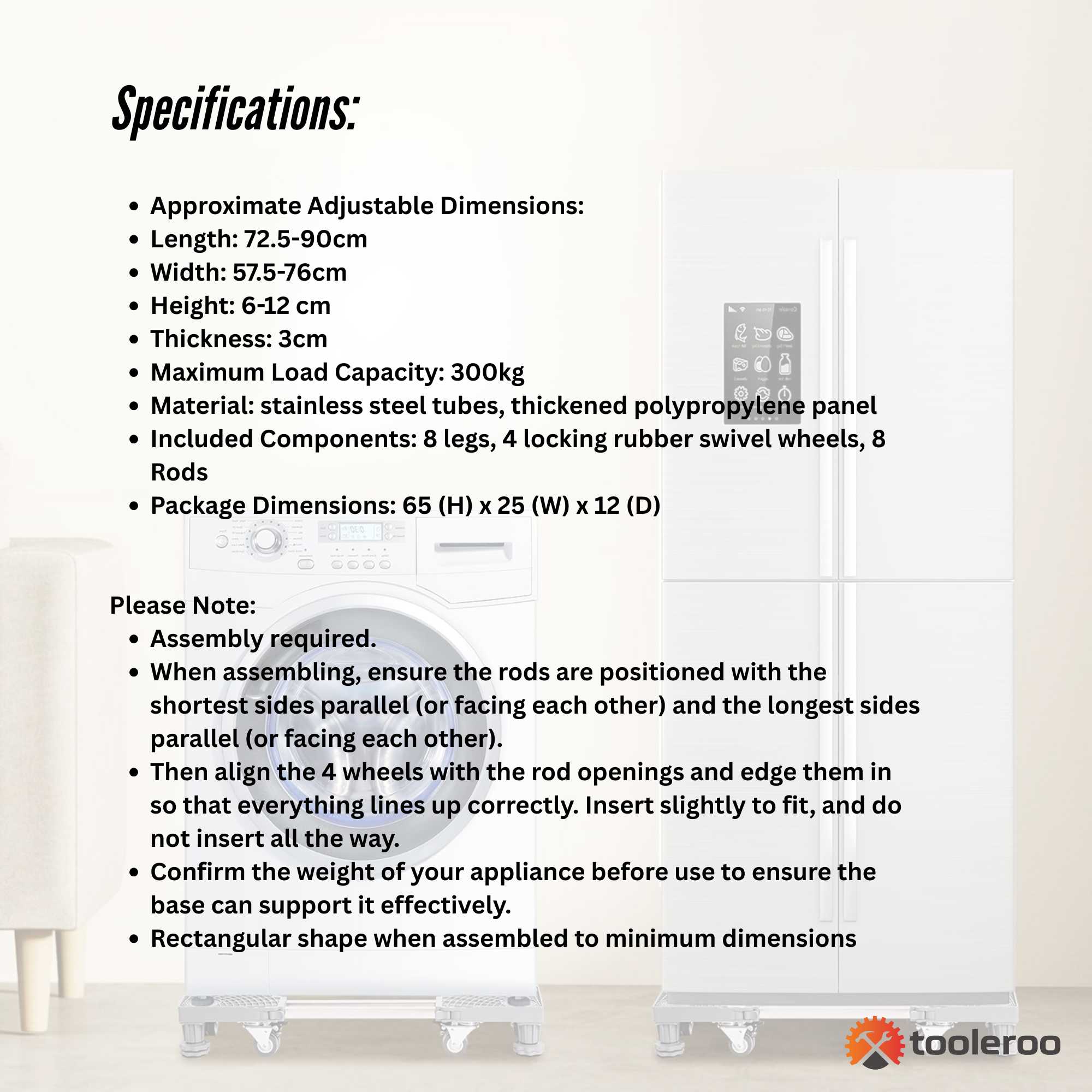 • 1x Adjustable appliance stand with all parts included