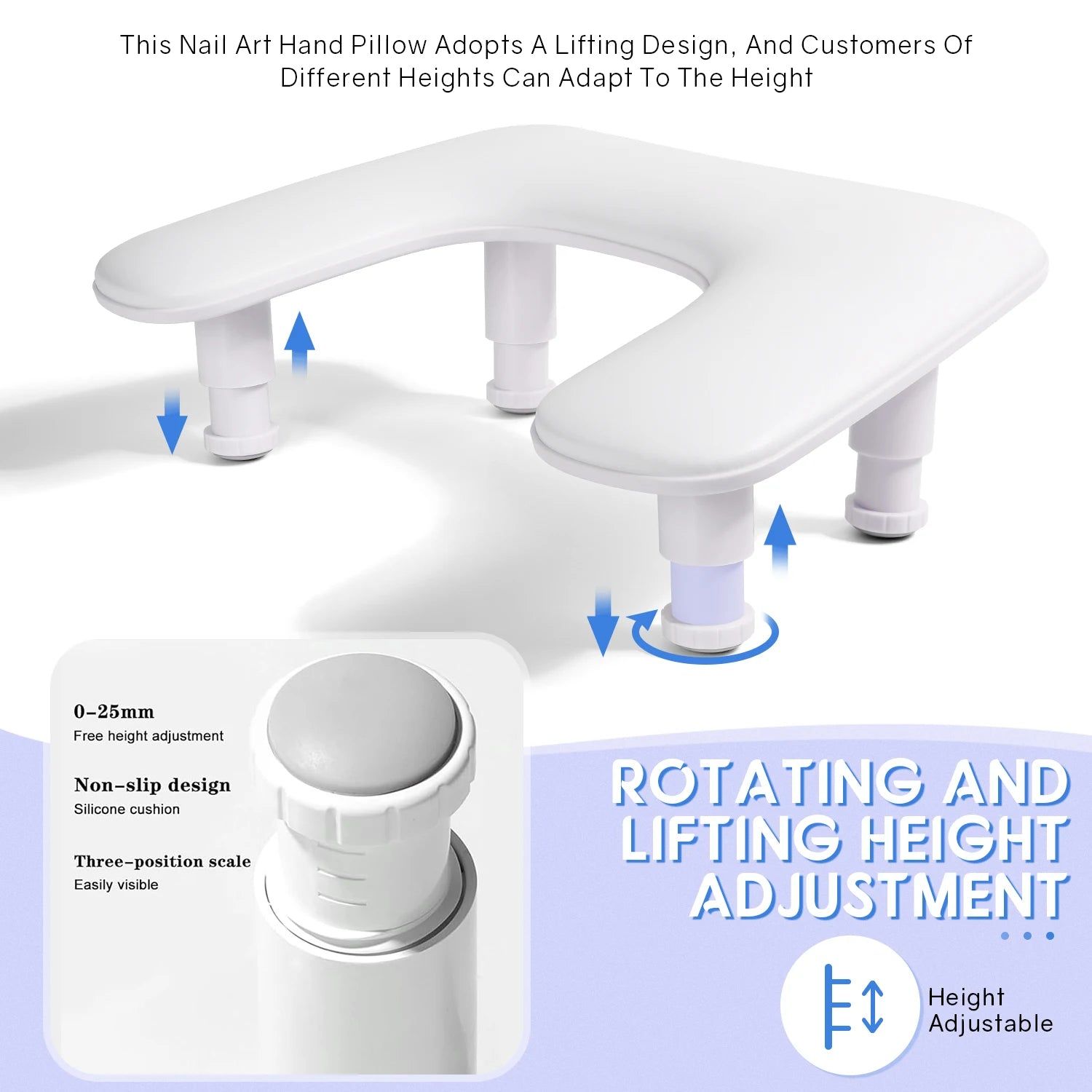 This adjustable nail art hand pillow stand is designed to provide ergonomic comfort and support during nail procedures. It features an adjustable height to enhance precision and accommodate different user needs. Made from durable, easy-to-clean materials, it is suitable for both professional salons and home use. Its sleek design adds a professional touch to any nail station.