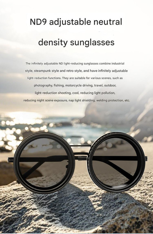 These adjustable sunglasses combine a steampunk retro design with advanced optical features. They offer stepless brightness adjustment, polarized HD anti-glare lenses, and versatile protection suitable for various outdoor and indoor activities. The unique design and durable construction make them both functional and stylish for different environments.