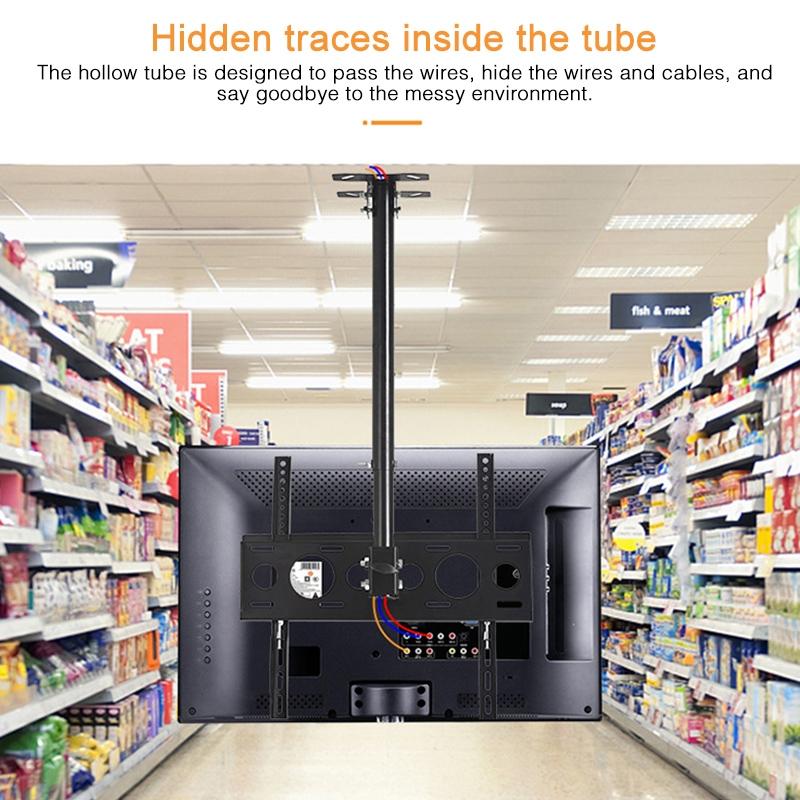 This adjustable single screen TV wall and ceiling mount is designed to support screens from 26 to 60 inches. It offers versatile installation options, allowing it to be mounted on suspended ceilings or walls. The mount features a telescopic pole for manual height adjustment, 360-degree rotation for flexible viewing angles, and a 30-degree tilt for optimal positioning. Its screw lock design ensures stability and safety, while the hidden wiring system provides a clean and organized appearance.