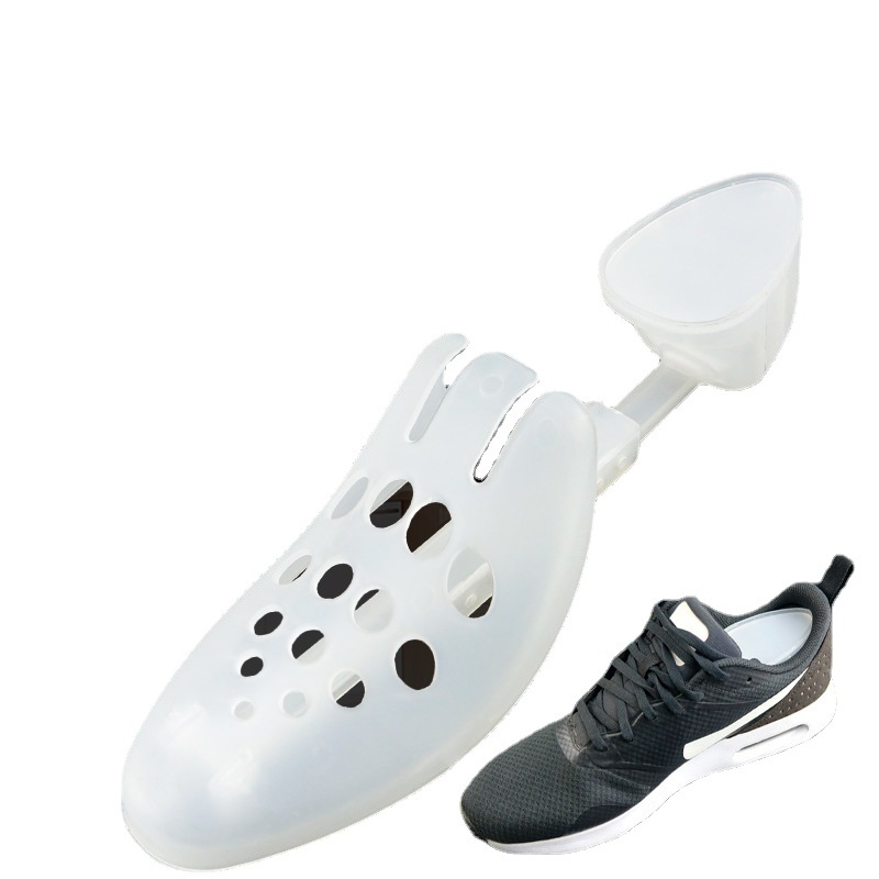 This adjustable transparent shoe tree stretcher is designed to fit shoe sizes EUR 40-45. It helps maintain the shape of shoes, prevent creases, and extend their lifespan. The lightweight and flexible design allows easy adjustment and insertion into various types of shoes. Ventilation holes help keep shoes fresh and odor-free, making it an ideal accessory for shoe care.