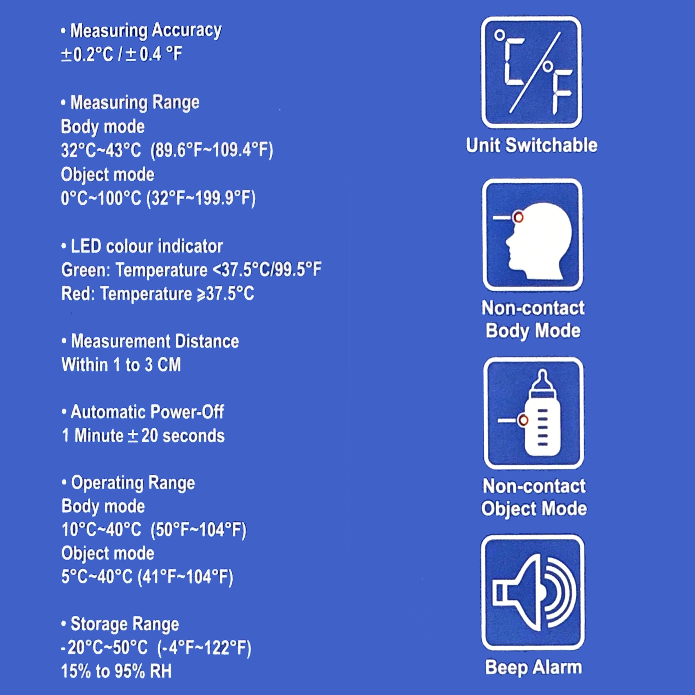 - Measures human body temperature from the forehead and surface temperatures of objects