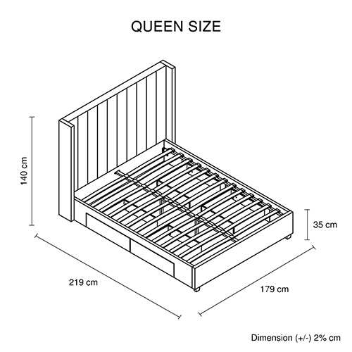 Alexa Queen Size High Rise Headboard Linen Beige Fabric Four MDF Drawers with Wheels Bed Frame