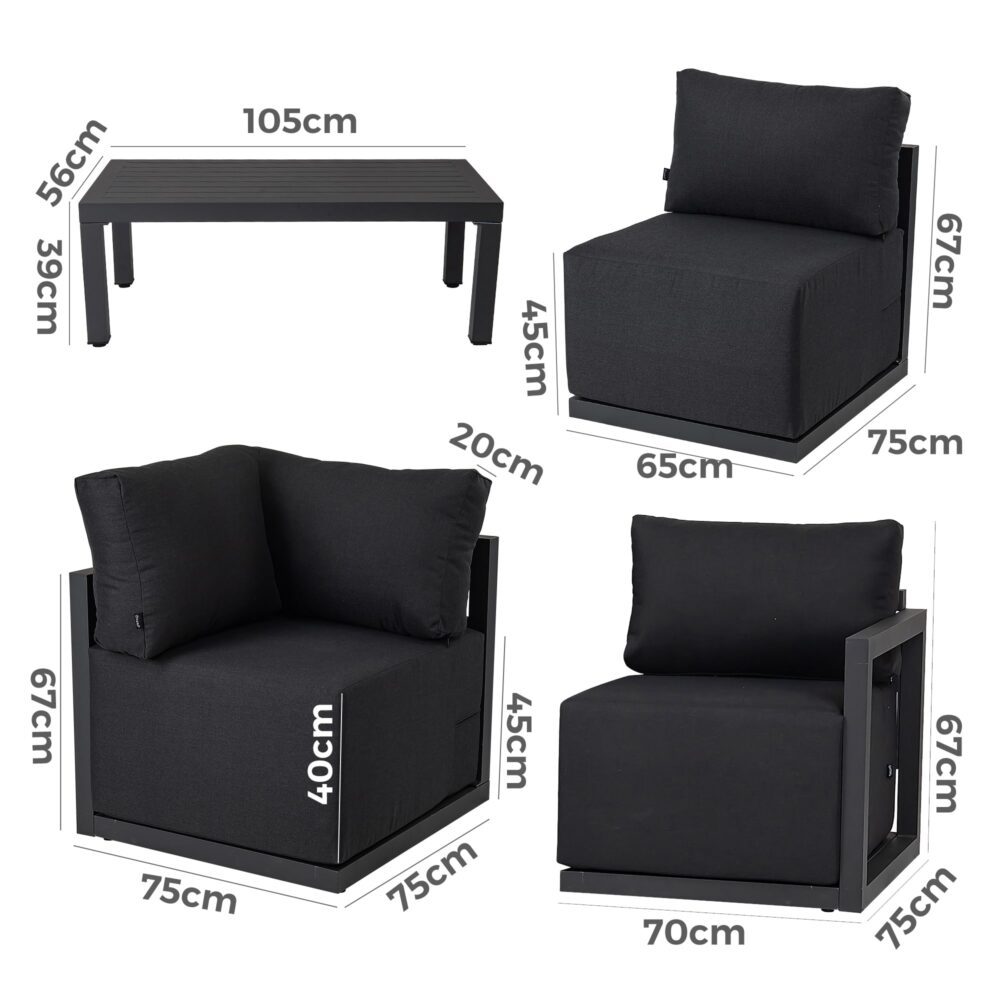 Constructed primarily from aluminum, this lounge set is built to withstand harsh weather conditions, ensuring a long-lasting outdoor furniture solution. The cushions are generously thick, offering enhanced comfort, and feature removable covers for easy cleaning and maintenance.