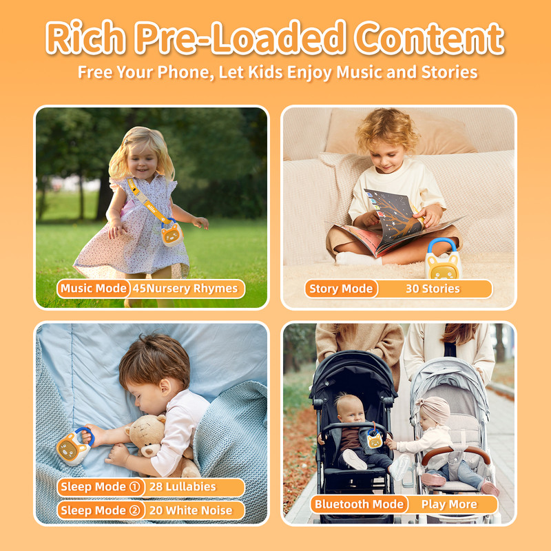 • Over 120 pre-loaded audio pieces including stories, music, lullabies, and sounds