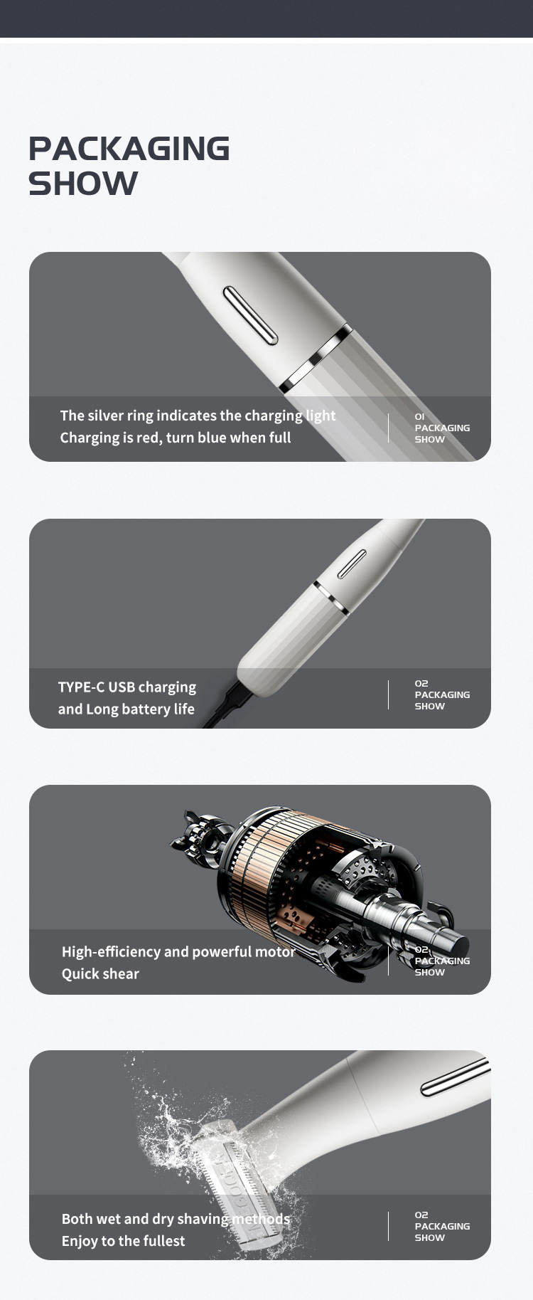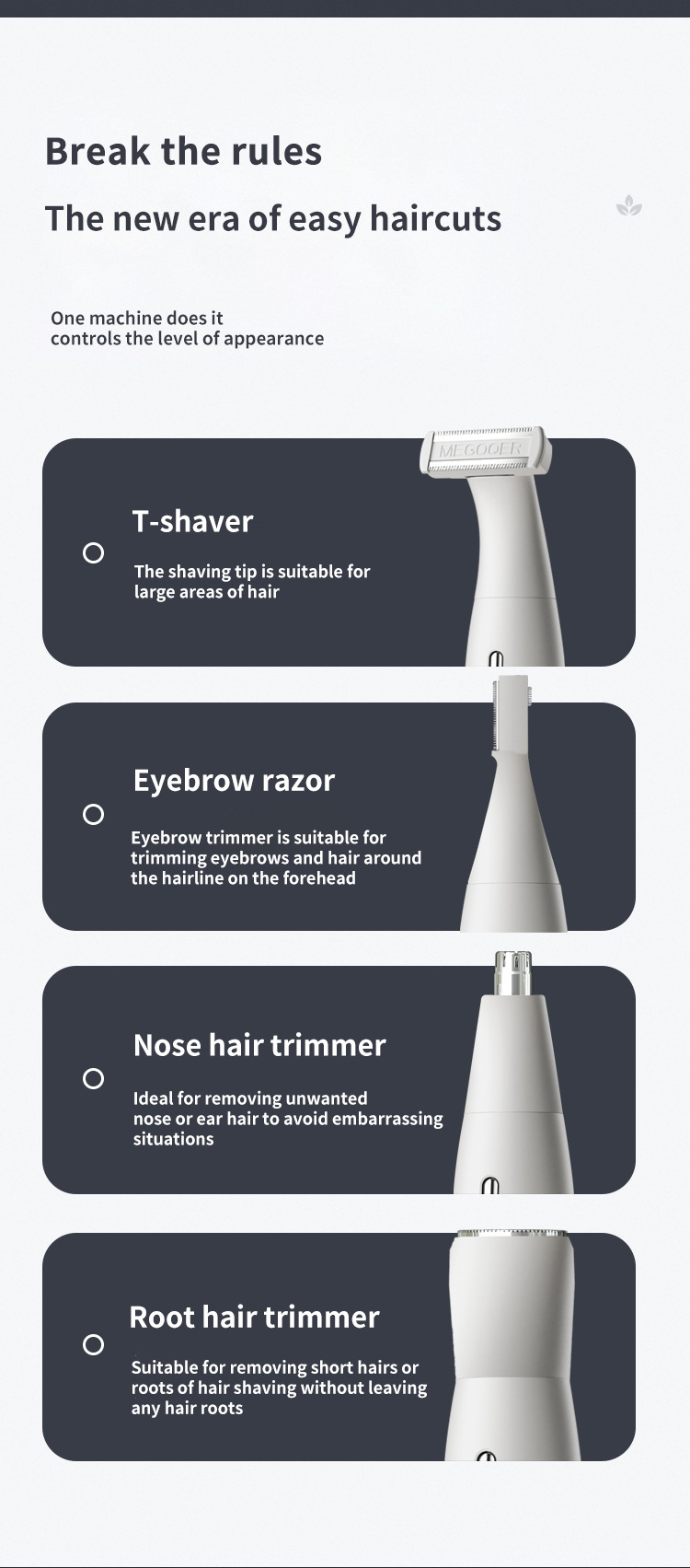 - Four interchangeable heads for comprehensive grooming: T-shaver, eyebrow razor, nose hair trimmer, and root hair trimmer