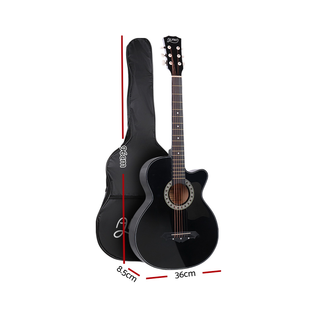 Alpha 38 Inch Acoustic Guitar Wooden Body Steel String Full Size w/ Stand Black