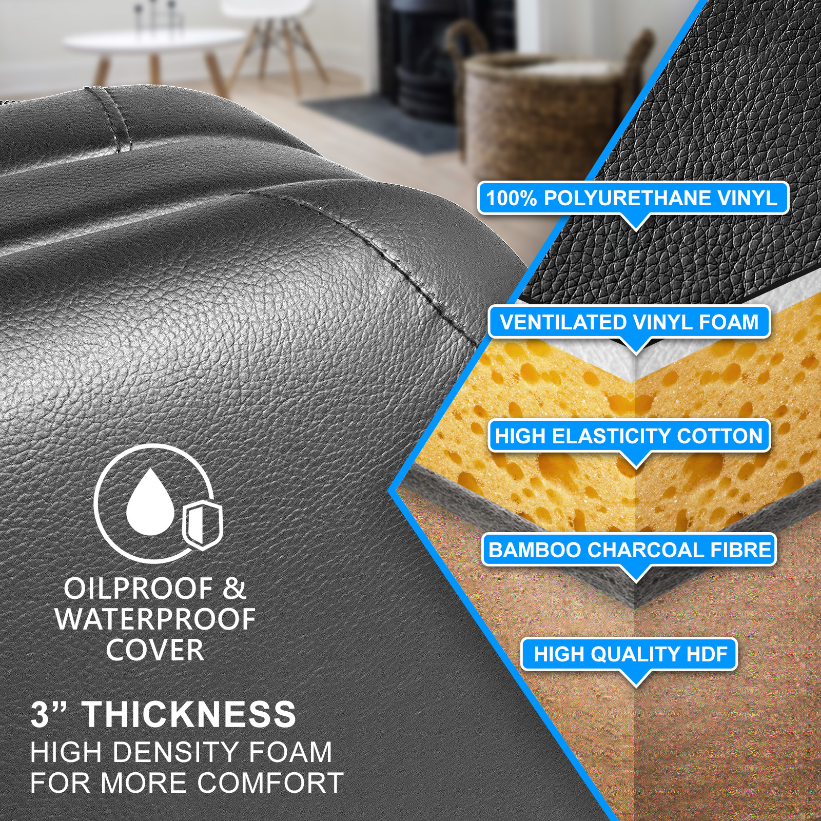 - Upholstered with waterproof and oil-resistant PVC leather