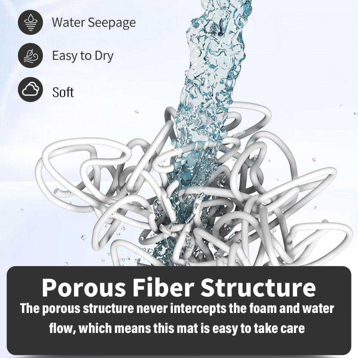 This shower mat is designed to enhance safety and comfort in your bathroom. It features a non-slip surface to provide stability in wet conditions and a porous fiber structure that allows water to drain efficiently, preventing mold and mildew buildup. Its soft texture offers a comfortable experience, making it a practical addition to any bathroom.