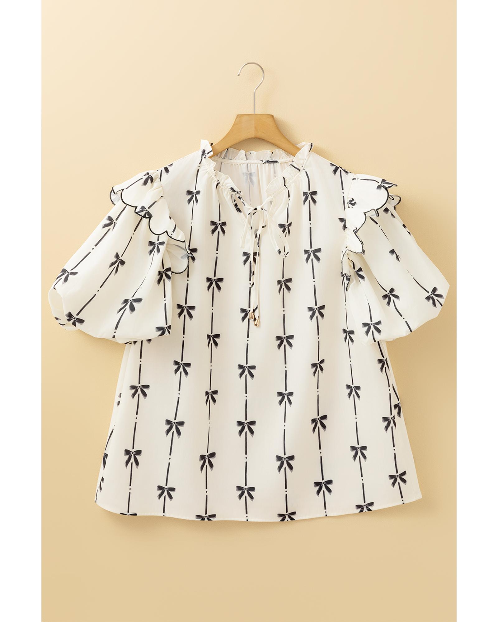Apricot Bow Printed Ruffled Bubble Sleeve Lace-up Notched Neck Plus Size Blouse – 1X