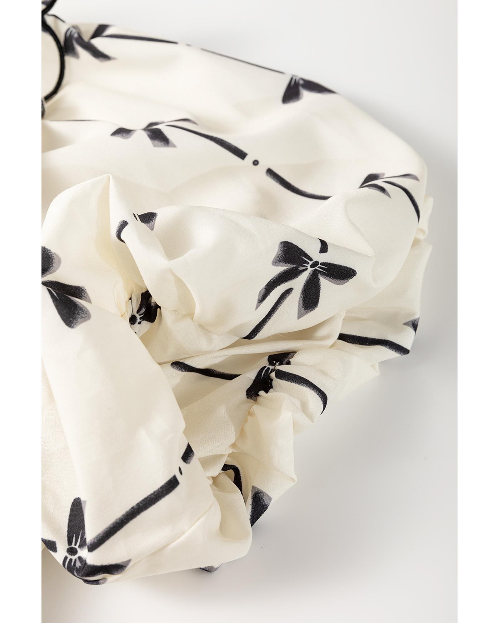 - Features include ruffled bubble sleeves for a voluminous silhouette and a frilled notched neck with lace detailing.