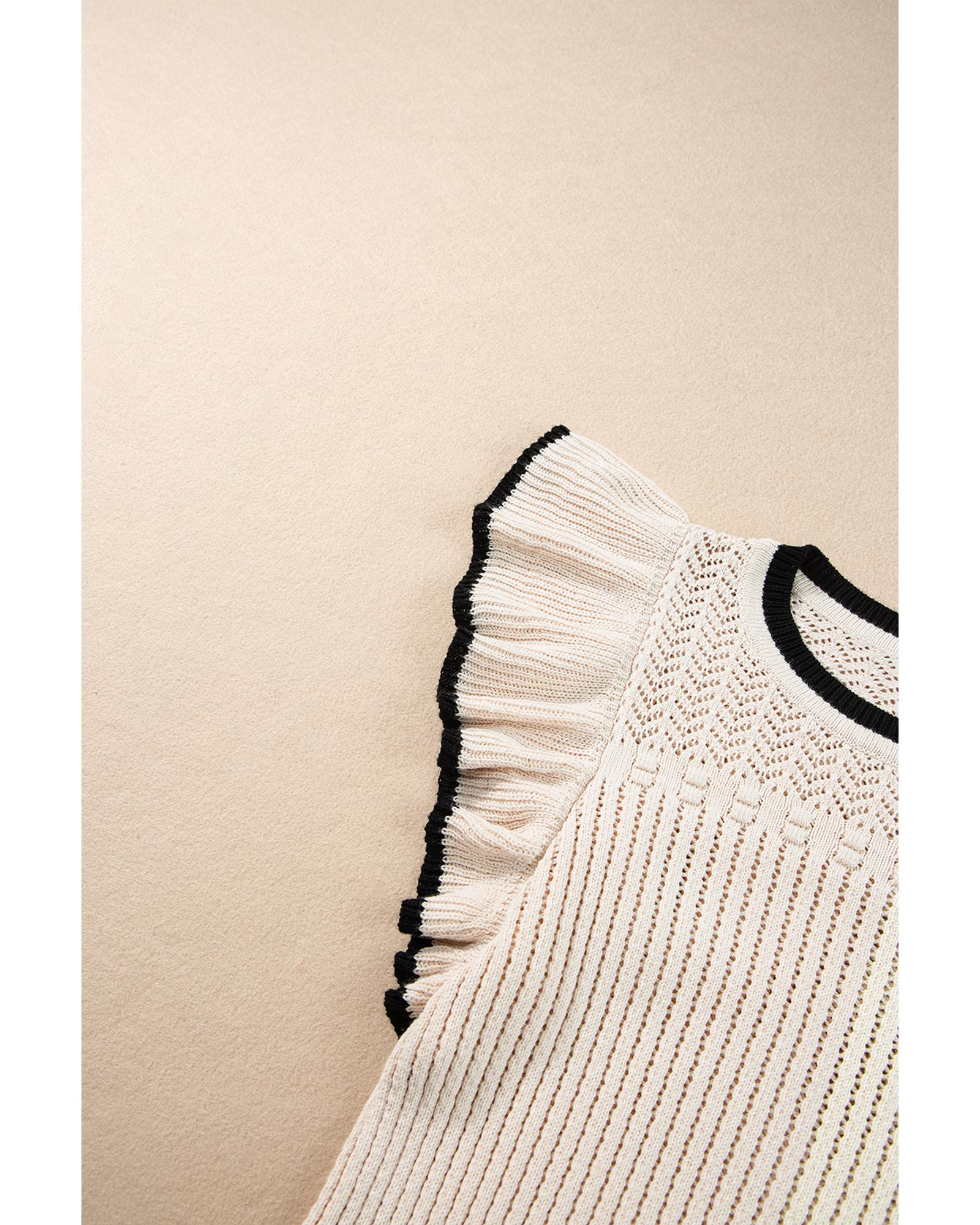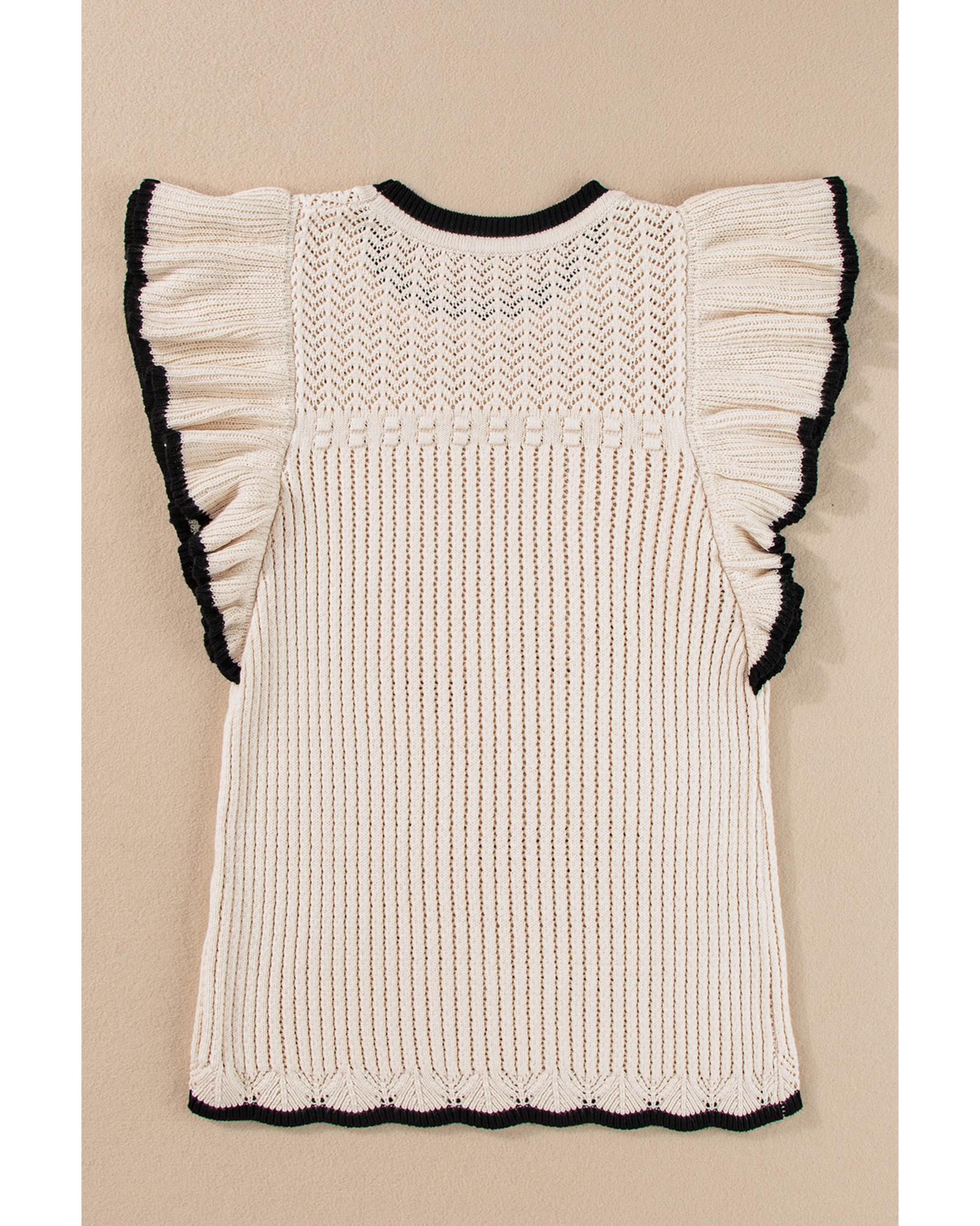 This crochet eyelet flounce tank top features a trendy fitted design with a feminine and sexy appearance. It is crafted from high-quality crochet knit fabric and includes a contrasting flounced trim for added style. The cropped length makes it a versatile piece that pairs well with high-waisted bottoms, suitable for various social occasions.