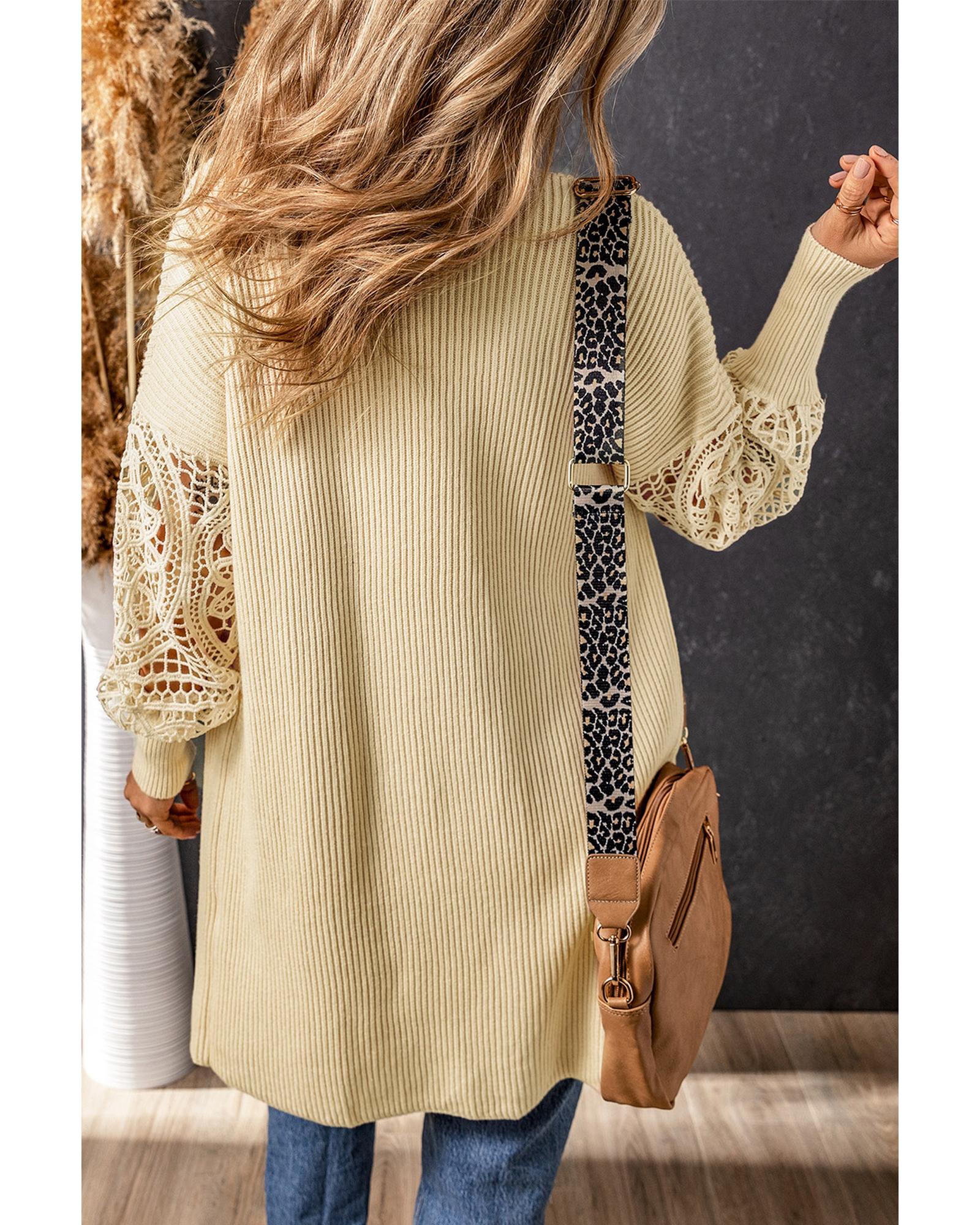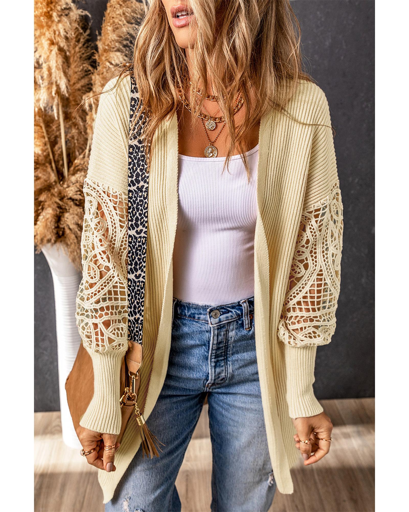 This crochet lace sleeve ribbed knit cardigan offers a stylish and versatile addition to your wardrobe. Designed with a trendy fitted silhouette, it features an open front and intricate crochet lace detailing on the sleeves, making it suitable for various casual and semi-formal outfits.