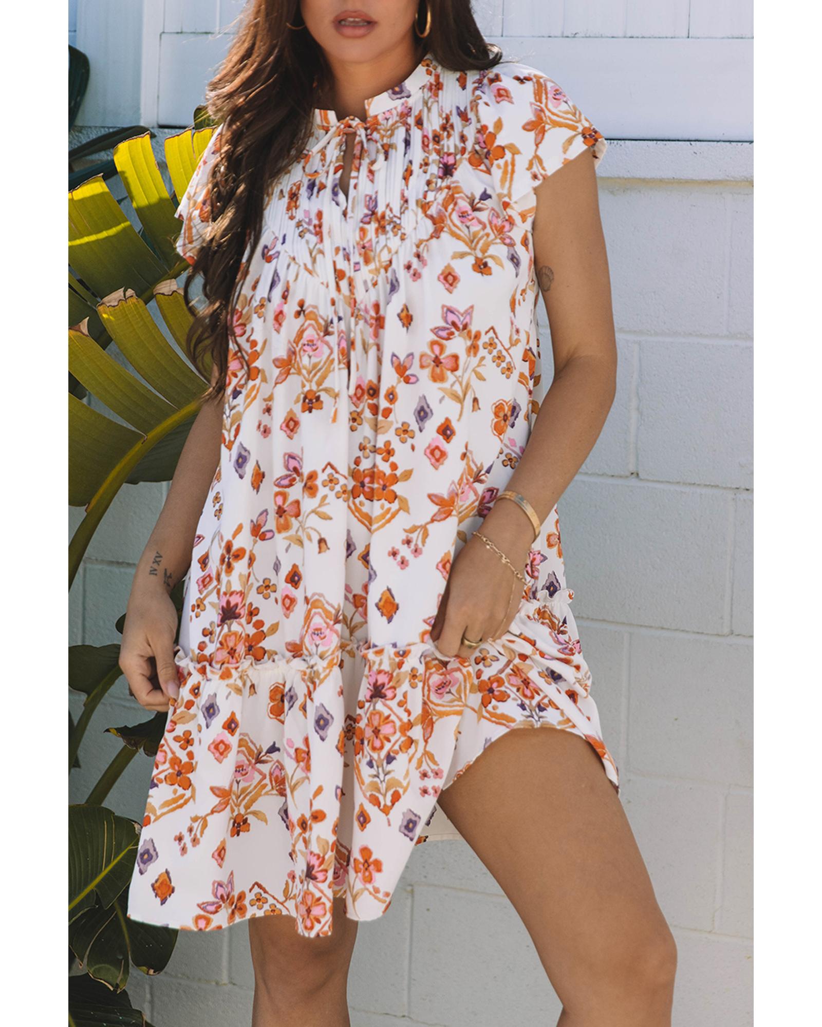 This mini dress features a stylish floral and geometric print, perfect for a trendy and fashionable look. The delicate ruffled trim adds a playful detail, while the flutter sleeves enhance its feminine and flirty style. It can be paired with heels or sandals to create a charming and versatile outfit.