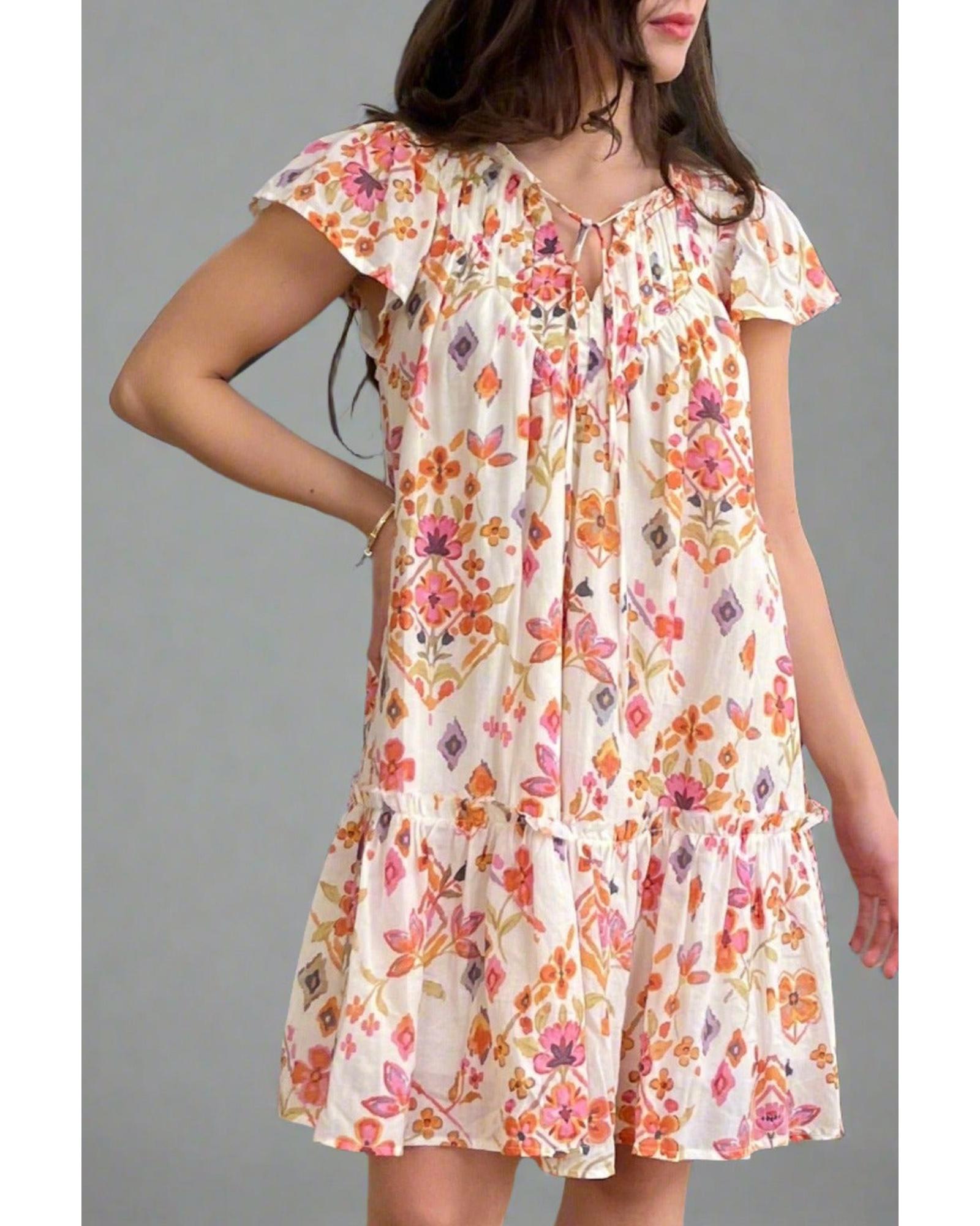 Apricot Floral Geometric Print Ruffled Trim Flutter Sleeve Mini Dress – L